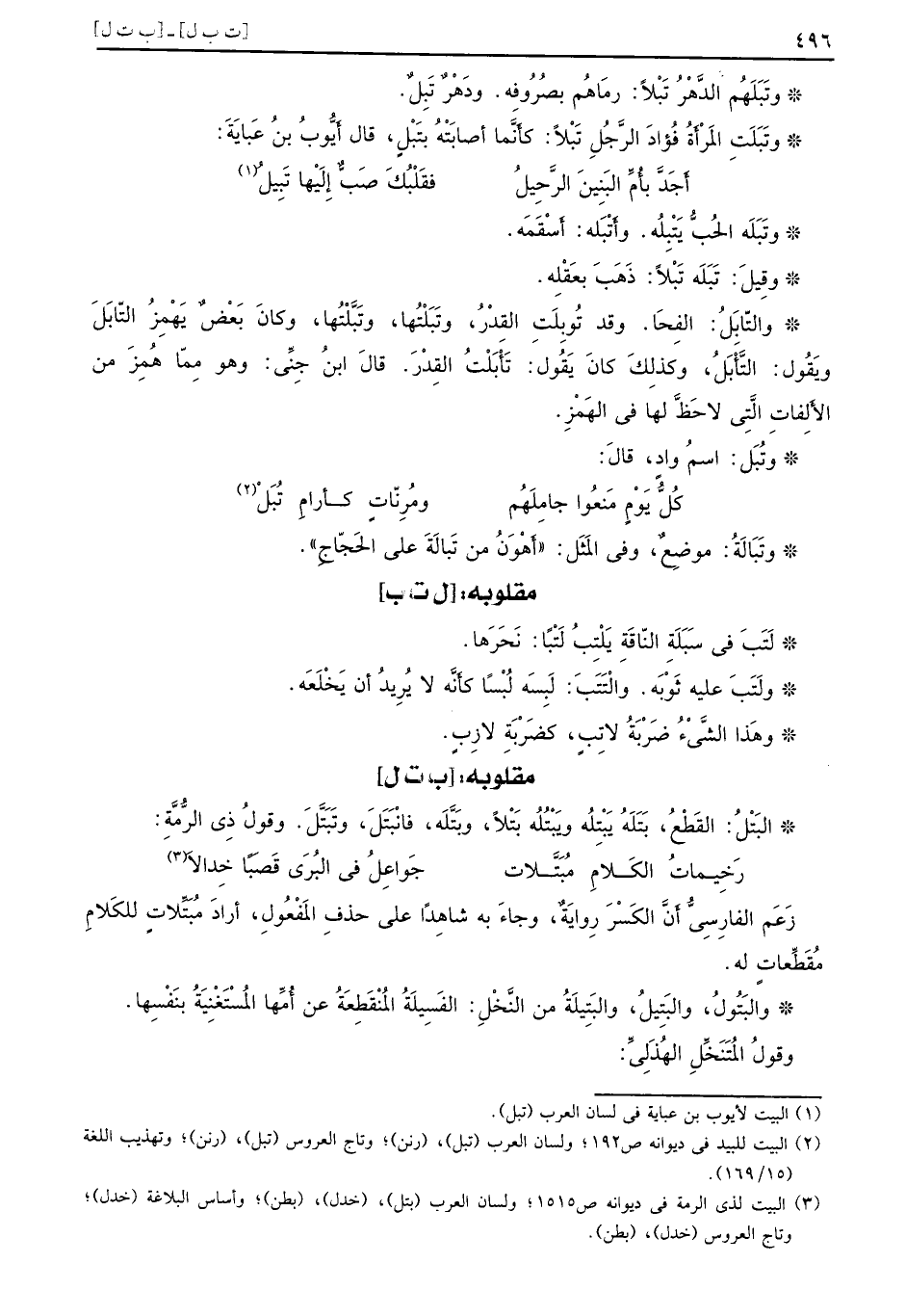 : [ب ت ل] البَتْلُ: القَطْعُ: بَتَلَهُ يَبْتِلُه ويَبْتُلُه بَتْلاً، وبَتَّلَه، فانْبَتَلَ، وتَبَتَّلَ. وقولُ ذِي الرُّمَّة: