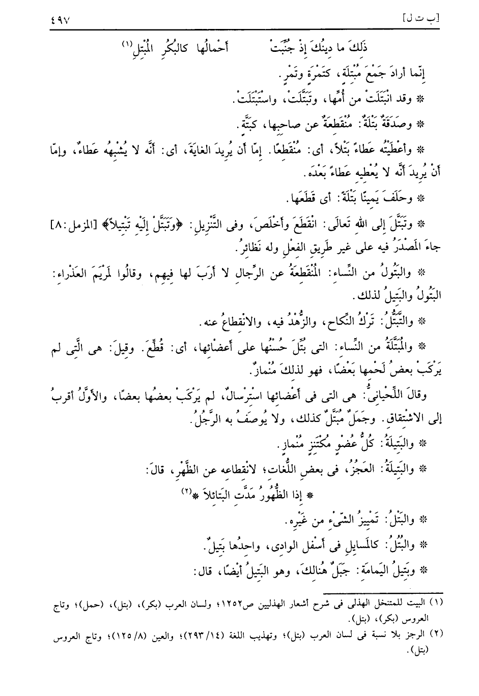 إِنّما أرادَ جَمْعَ مُبْتَلةَ، كتَمْرَةٍ وتَمْرٍ. وقد انْبَتَلَتْ من أُمِّها، وتَبَتَّلَتْ، واسْتَبْتَلَتْ. وصَدَقَةٌ بَتْلَةُ: مُنْقَطِعَةٌ عن صاحِبِها، كبَتَّةِ. وأعْطَيْتُه عَطاءُ بَتْلاً، أي: مُنْقَطِعاً. إِمّا أَن يُرِيدَ الغايَةَ، أي: أَنَّه لا يُشْبِهُه عَطاءٌ، وإمّا أَنْ يُريدَ أَنَّه لا يُعْطِيهِ عَطاءُ بَعْدَه. وحَلَف يَمِينًا بَتْلَةً: أي قَطَعَها. وتَبَتَّلَ إِلى اللهِ تَعالَى: انْقَطَعَ وأَخْلَصَ، وفي التَّنْزِيلِ: {وتَبَتَّلْ إِلَيْهِ تَتْبِيلاً} [المزمل: 8] جاءَ المَصْدَرُ فيه على غير طَرِيقِ الفِعْلِ وله نَظائِرُ: والبَتولُ من النِّساءِ: المُنْقَطِعَةُ عن الرِّجالِ لا أَرَبَ لها فِيهمِ، وقالُوا لَمْرَيمَ العَذْرِاء: البَتُولُ والبَتِيلُ لذلك. والتَّبُّتلُ: تَرْكُ النِّكاح، والزُّهْدُ فيه، والانْقِطاعُ عنه. والمُبَتَّلَةُ من النِّساءِ: التي بُتِّلَ حُسْنُها على أَعضْائِها، أي: قُطِّعَ. وقِيلَ: هي الَّتِي لم يَرْكَبْ بعضُ لحمها بَعْضاً، فهو لذِلكَ مُنْمازٌ. وقالَ اللِّحْيانِيُّ: هي التي في أَعْضائِها اسْتِرْسالٌ، لم يَرْكَبْ بعَضهُا بعضاً، والأَوَّلُ أقربُ إلى الاشْتِقاق. وجَمَلٌ مُبَتَّلٌ كذلك، ولا يُوصَفُ به الرَّجُلُ. والبَتِيلَةُ: كُلُّ عُضْو مُكْتَنِزٍ مُنْمازٍ. والبَتِيلَةُ: العَجْزُ، في بعَض اللُّغات؛ لانْقِطاعه عن الظَّهْرِ، قالَ: