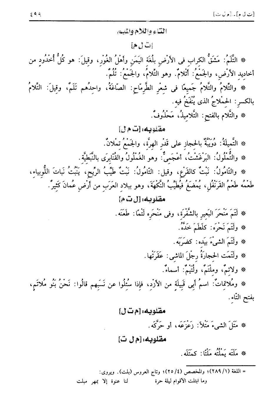 [ت ل م] التَّلَمُ: مَشٌ قُّ الكِرابِ في الأَرْضِ بُلغَةِ اليَمَنِ وأَهْلُ الغُوْرِ، وقِيلَ: هو كُلُّ أُخْدُودٍ من أخادِيدِ الأَرْضِ، والجَمْعُ: أَتْلامٌ. وهو التِّلامُ، والجَمْعُ: تُلُمٌ. والتِّلامُ والتِّلامُ جَميعاً في شِعْرِ الطَّرِمّاحِ: الصّاغَةُ، وأحِدُهم تَلَمٌ , وقيل: التِّلامُ بالكسرِ: الحٍ مْلاجُ الذي يُنْفَخُ فيهِ. والتَّلام بالفتحِ: التَلامِيذُ، مَحْذُوفٌ.