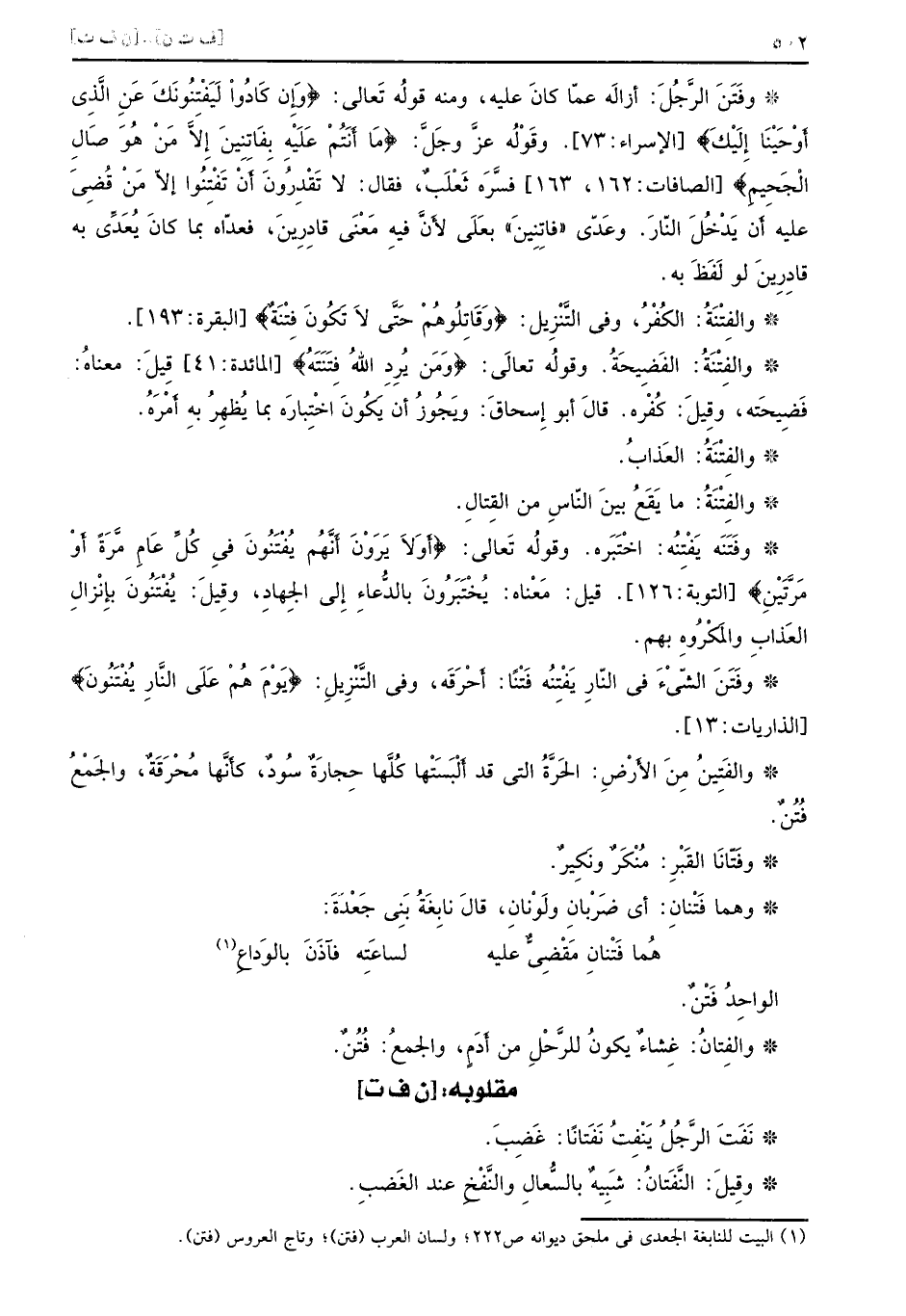 وفَتَنَ الرَّجُلَ: أزالَه عمّا كانَ عليه، ومنه قولُه تَعالى: {وإن كادوا ليفتنونك عن الذي أوحينا إليك} [الإسراء: 73] . وقَوْلُه عزَّ وجَلَّ: {ما أنتم عليه بفاتنين إلا من هو صال الجحيم} [الصافات: 162، 163] فسَّرَه ثَعْلَبٌ، فقال: لا تَقْدِرُونَ أَنْ تَفْتِنُوا إلاّ مَنْ قُضِيَ عليه أَن يَدْخُلَ النّارَ. وعَدّى ((فاتِنِينَ)) بعَلَى لأَنَّ فيهِ مَعْنَى قادِرِينَ، فعدّاه بما كانَ يُعَدِّى به قادِرِينَ لو لَفَظ به. والفِتْنَةُ: الكُفْرُ، وفي التَّنْزِيل: {وقاتلوهم حتى لا تكون فتنة} [البقرة: 193] . والفِتْنَةُ: الفَضِيحَةُ. وقولُه تعالَى: {ومن يرد الله فتنته} [المائدة: 41] قِيلَ: معناهُ: فَضِيحَته، وقِيلَ: كُفْره. قالَ أبو إِسحاقَ: ويَجُوزُ أن يَكُونَ اخْتِبارَه بما يُظْهِرُ بهِ أَمْرَهُ. والفِتْنَةُ: العَذابُ. والفِتْنَةُ: ما يَقَعُ بينَ النّاسِ من القِتالِ. وفَتَنَه يَفْتِنُه: اخْتَبَره. وقولُه تَعالى: {أَوَلاَ يَرَوْنَ أَنَّهُم يُفْتَنُونَ فيِ كُلِّ عَامِ مَّرَةً أَوْ مَرَّتَيْنِ} [التوبة: 126] . قيل: مَعْناه: يُخْتَبَرُونَ بالدُّعاءِ إلى الجِهادِ، وقِيلَ: يُفْتَنُونَ بِإنْزالِ العَذابِ والمَكْرُوهِ بهم. وفَتَنَ الشّيْءَ في النّارِ يَفْتِنُه فَتْنًا: أَحْرَقَه، وفي التَّنْزِيلِ: {يوم هم على النار يفتنون} [الذاريات: 13] . والفَتِينُ مِنَ الأَرْضِ: الحَرَّةُ التي قد أَلْبَسَتْها كُلَّها حِجارَةٌ سُودٌ، كأَنَّها مُحْرَقّةٌ، والجَمْعُ فُتُنٌ. وفَتّانَا القَبْرِ: مُنْكَرٌ ونَكِيرٌ. وهما فَتْنانِ: أي ضَرْبانِ ولَوْنانِ، قالَ نابِغَةُ بَنِى جَعْدَةَ.