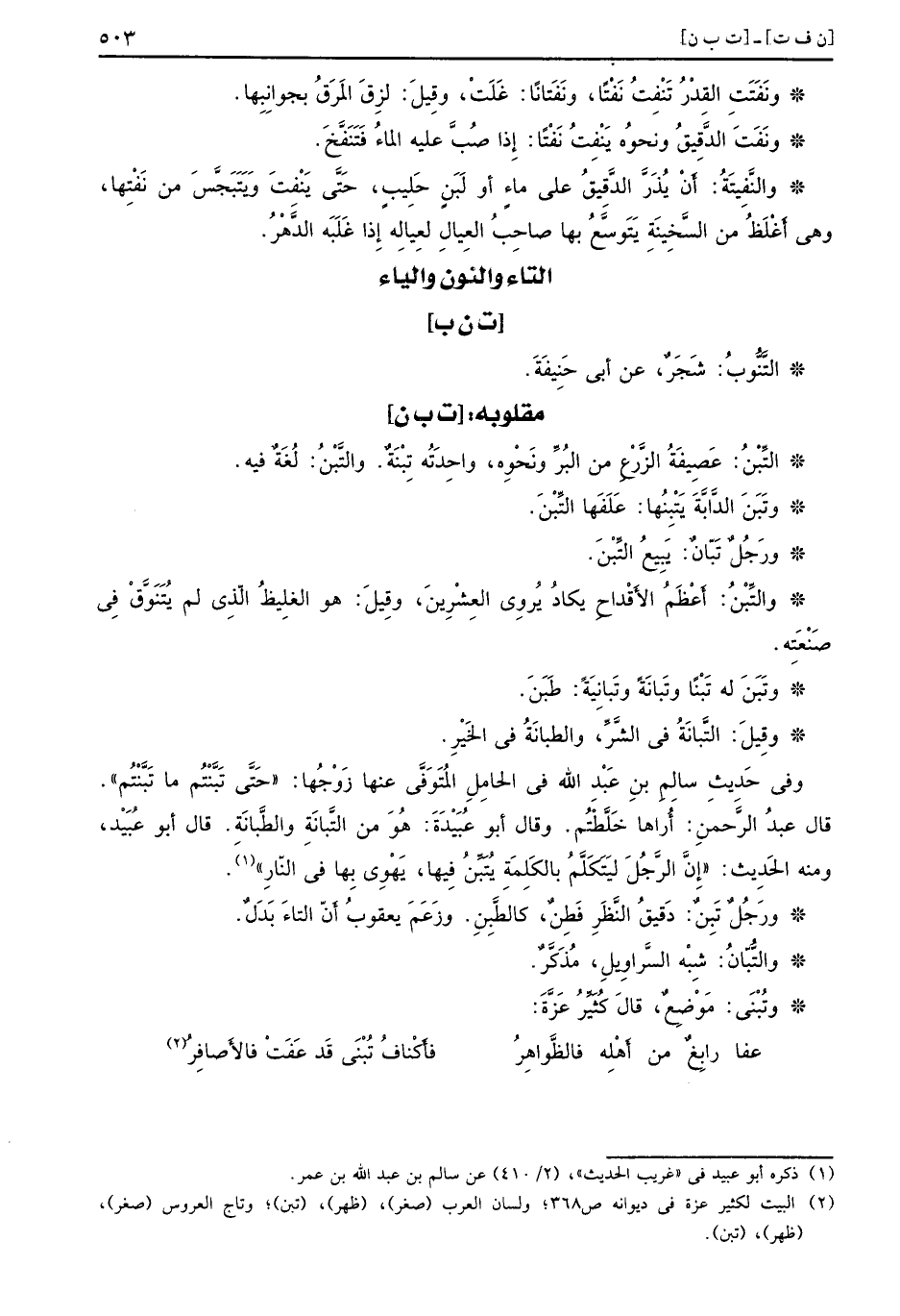 [ت ب ن] التِّبْنُ: عَصِيفَةُ الزَّرْعِ من البُرِّ ونَحْوِه، واحِدَتُه تِبْنَةٌ. والتَّبْنُ: لُغَةٌ فيه. وتَبَنَ الدَّابَّةَ يَتْبِنُها: عَلَفَها التِّبْنَ. ورَجُلٌ تَبّانٌ: يَبِيعُ التِّبْنَ. والتِّبْنُ: أَعْظَمُ الأَقْداحِ يكادُ يُروِى العِشْرِينَ، وقِيلَ: هو الغلِيظُ الّذِي لم يُتَنَوَّقْ فِي صَنْعَتِه. وتَبَنَ له تَبْنًا وتَبانَةً وتَبانِيَةً: طَبَنَ. وقِيلَ: التَّبانَةُ في الشَّرِّ، والطبانَةُ في الخَيْرِ. وفي حَدِيثِ سالِمِ بنِ عَبْدِ الله في الحامِلِ المُتَوَفَّى عنها زَوْجَها: ((حَتَّى تَبَّنْتُم ما تَبَّنْتُم)) . قال عبدُ الرَّحمنِ: أُراها خَلَّطْتُم. وقال أبو عُبَيْدَةَ: هُوَ من التَّبانَةِ والطَّبانَةِ. قال أبو عُبَيْد، ومنه الحَدِيث: ((إِنَّ الرَّجُلَ لَيَتَكَلَّمُ بالكَلِمَةِ يُتَبِّنُ فِيها، يَهْوِى بِها في النّارِ)) . ورَجُلٌ تَبِنٌ: دَقيقُ النَّظَرِ فَطِنٌ كالطَّبِنِ. وزَعَمَ يعقوبُ أَنّ التاءَ بَدَلٌ. والتُّبّانُ: شِبْه السَّراوِيلِ، مُذَكَّرٌ. وتُبْنَى: مَوْضِعٌ قالَ كُثَيِّرُ عَزَّةَ: