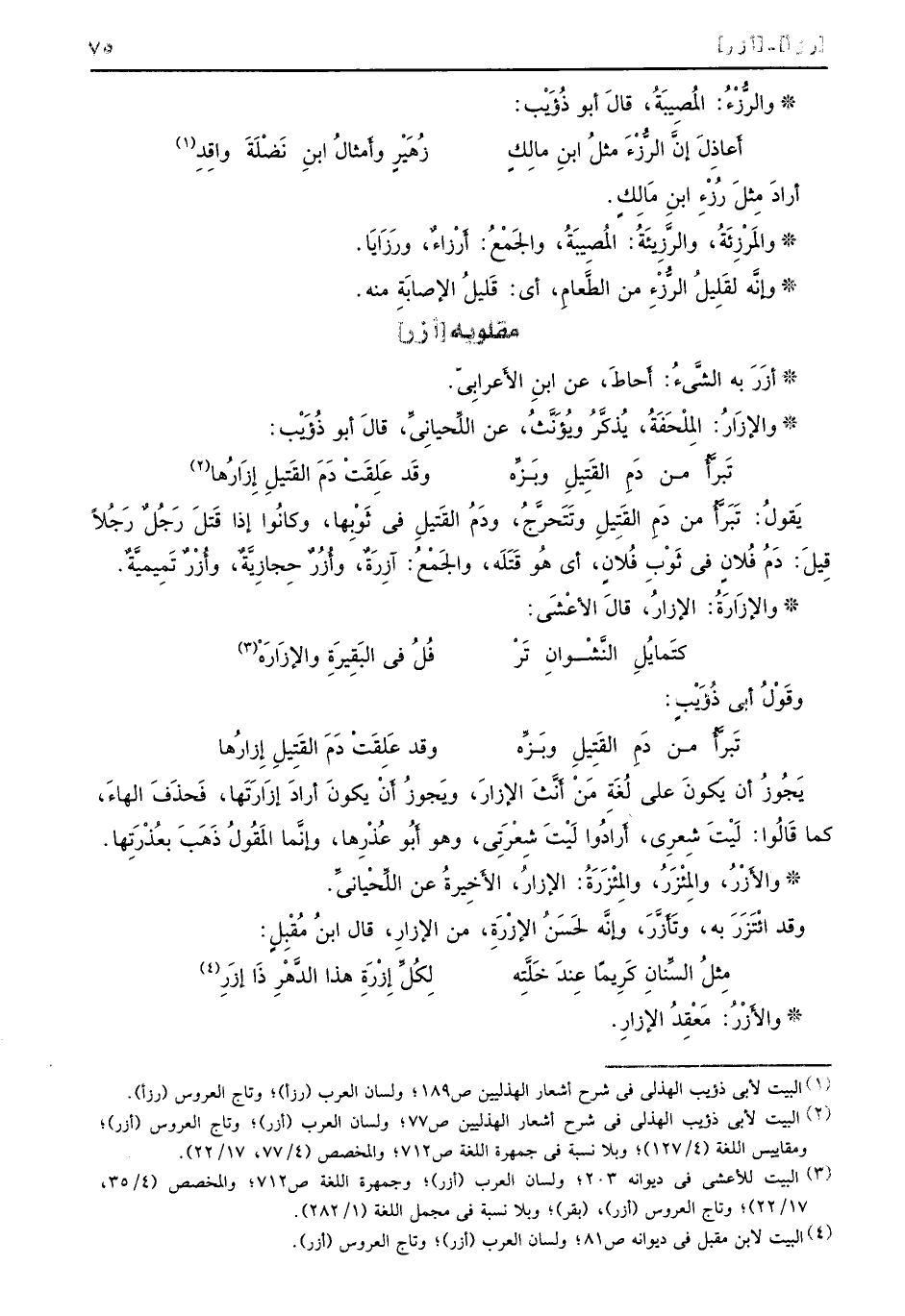 يَقولُ: تَبَرَّأُ عن دَمِ القَتِيلِ وتَتَحرَّجُ، ودَمُ القَتيلِ في ثَوْبِها، وكانُوا إذا قَتلَ رَجُلٌ رَجُلاً قِيلَ: دَمُ فُلانُ في ثَوْبِ فُلانِ، أي هُو قَتَلَه، والجَمْعُ: آزِرَةٌ، وأُزُرٌ حِجازِيَّةٌ، وأُزْرٌ تَمِيميَّةٌ. والإزَارَةُ: الإزارُ، قالَ الأعْشَي: