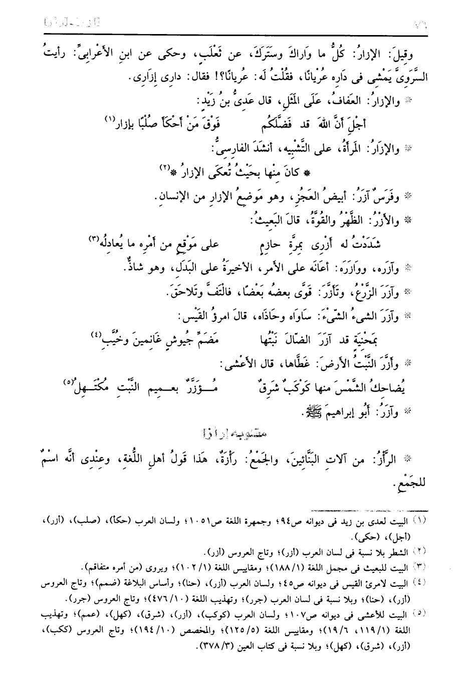وقِيلََ: الإزارُ: كُلُّ ما وَاراكَ وستَتَركَ، عن ثَعْلِب، وحكى عن ابنِ الأَعْرابِيٍّ: رأيتُ السَّرَوِيَّ يَمْشَى في دَارِه عُرْباناً، فقُلْتُ لَه: عُريانًا؟ فقال: دارِي إِزَارِي. والإزارُ: العَفافُ، عَلَى المَثَلِ، قال عَدِيُّ بنُ زَيْدٍ: