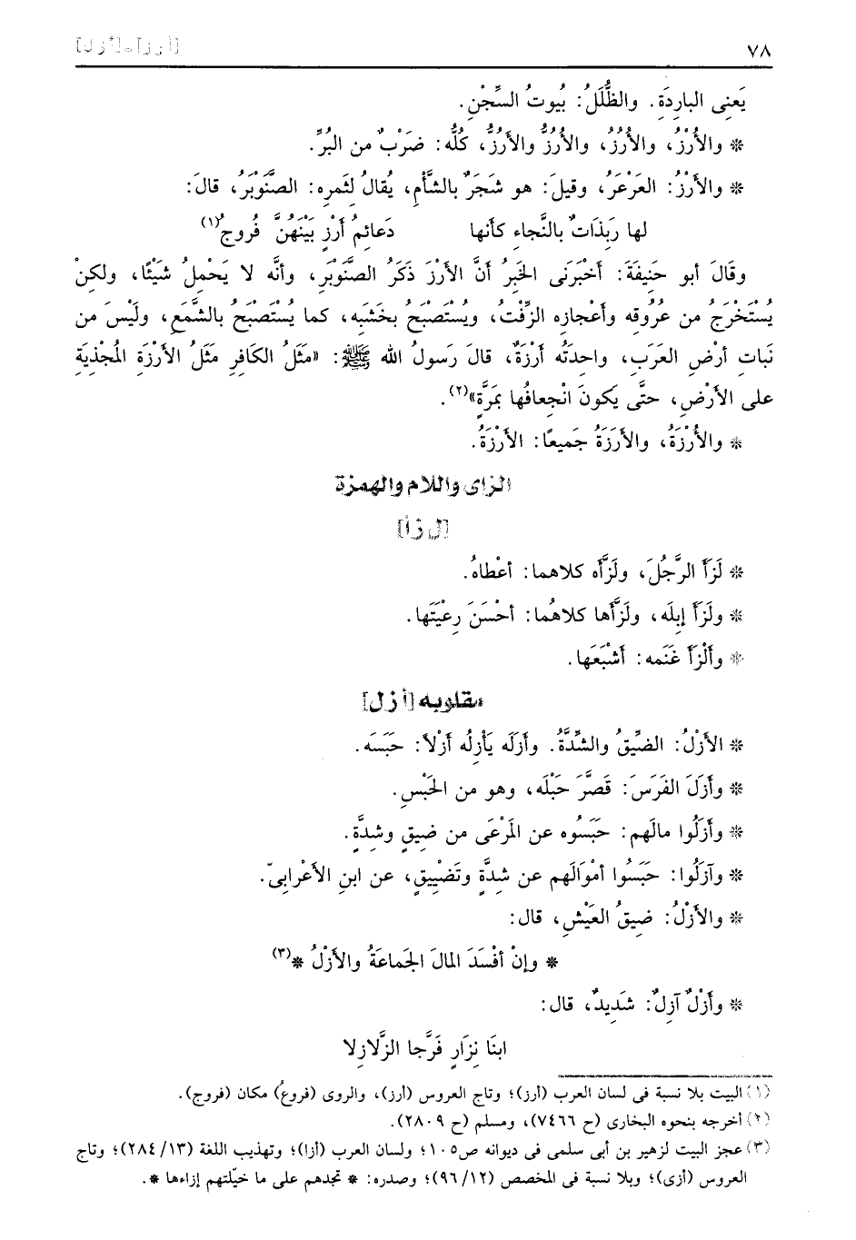 يعَنِي البارِدِةَ. والظُّلَلُ: بُيوتُ السِّجْنِ. والأُرْزُ، والأُرُزُ، والأرُزُّ والأَرُزُّ، كُلُّه: ضَرْبٌ من البُرِّ. والأَرْزُ: العَرْعَرُ، وقيلَ: هو شَجَرٌ بالشَّأْمِ، يُقالُ لِثَمِره: الصَّنَوْبَرُ، قالَ: