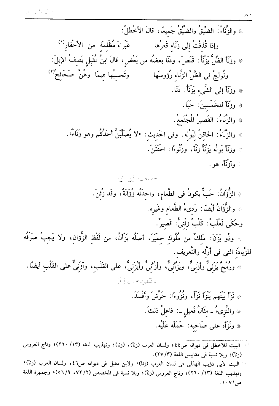 وزَنَأَ إلى الشَّيءِ يَزْنَأُ: دَنَا. وزَنَأَ للخَمْسِينَ: حَبَا. والزَّنَاءُ: القَصيرُ المُجْتَمِعُ. والزَّنَاءُ: الحاِقنُ لِبَوْلْه. وفي الحَديِثُ: ((لا يصُلَِّيَنَّ أَحَدُكُم وهو زَنَاءٌ)) . وزَنَأَ بَولُه يَزْنَأٌُ زَنْاً، وزُنُوءاً، احْتَقَنَ. وأزْنَأَه هو.