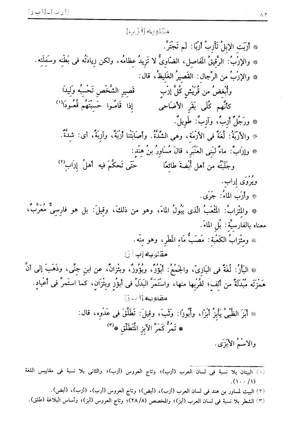 [أز ب] أرَبَتِ الإِبلُ تَأزِبُ أَرْبًا: لَم تَجْتَرَّ. والإزْبُ: الرَّقِيقُ المَفاصِل، الضّاوِيُّ لا تَزِيدُ عِظامُه، ولكن زِيادَتُه في بَطْنِه وسَفِلَتِه. والإزْبُ من الرِّجالِ: القَصِيرُ الغَلِيظُ، قال: