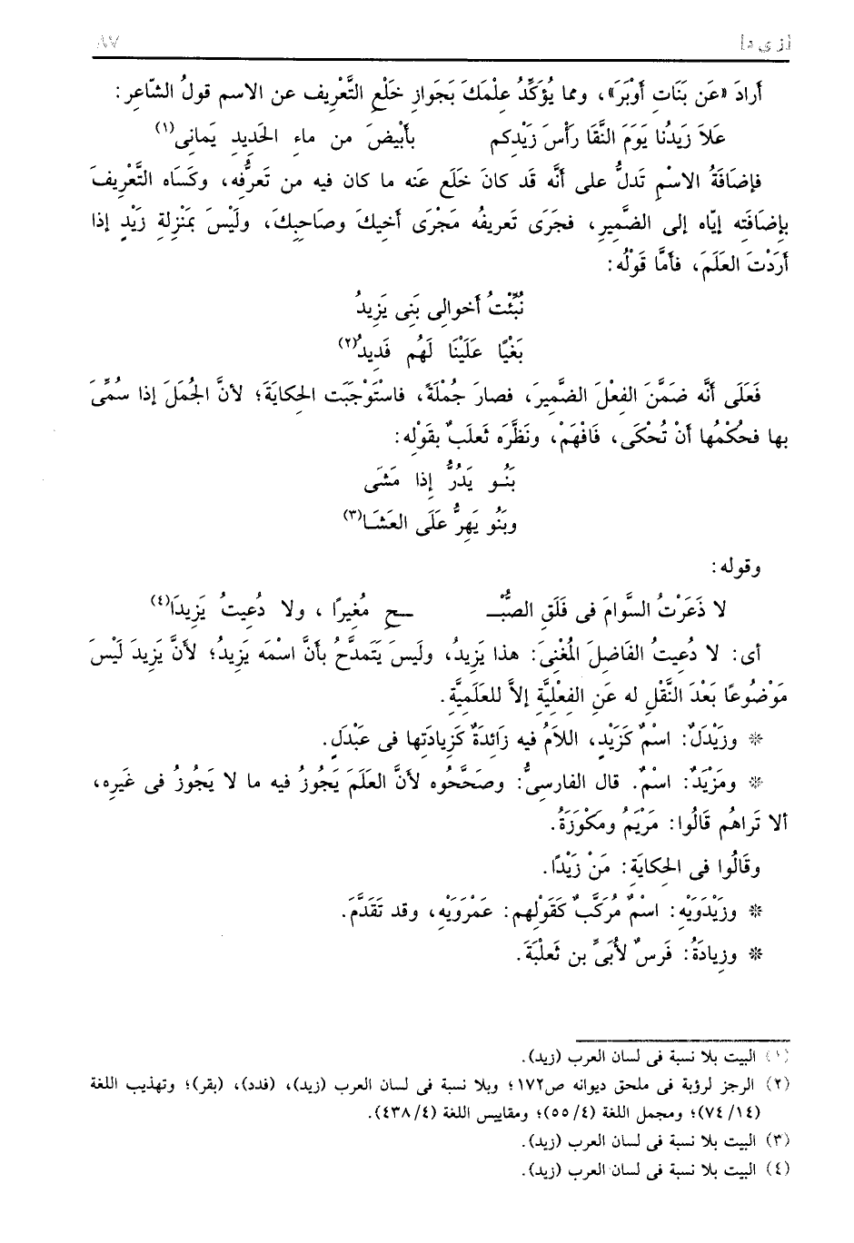 أي: لا دُعِيتُ الفَاضِلَ المُغْنَىَ: هذا يَزِيدُ، ولَيسَ يَتَمدِّحُ بأَنَّ اسمه يَزِيدٌ؛ لأَنَّ يَزِيدَ لَيْسَ مَوْضُوعاً بَعْدَ النَّقْلِ له عِنِ الفِعْلِيَّةِ إلاَّ للعَلَمِيَّةِ. وزَيْدَلٌ: اسْمٌ كَزَيْدٍ، اللاَمُ فيه زَائِدَةٌ كَزِيادَتها في عَبْدَلٍ. ومَزْيِدٌ: اسْمٌ. قال الفارسِيُّ: وصحَّحُوه لأَنَّ العَلَمَ يَجُوزُ فيه ما لا يَجُوزُ في غَيره، ألا تَراهُم قَالَوا: مَرْيَمُ ومَكْوَزَةُ. وقَالَوا في الحِكايَةَ: مَنْ زَيْداً. وزَيْدَوَيْهِ: اسْمٌ مُرَكَّبٌ كَقَوْلِهم: عَمْرَوَيْهِ، وقد تَقَدَّمَ. وزِيادَةُ: فَرسٌ لأُبَىِّ بن ثَعلْبَةَ.