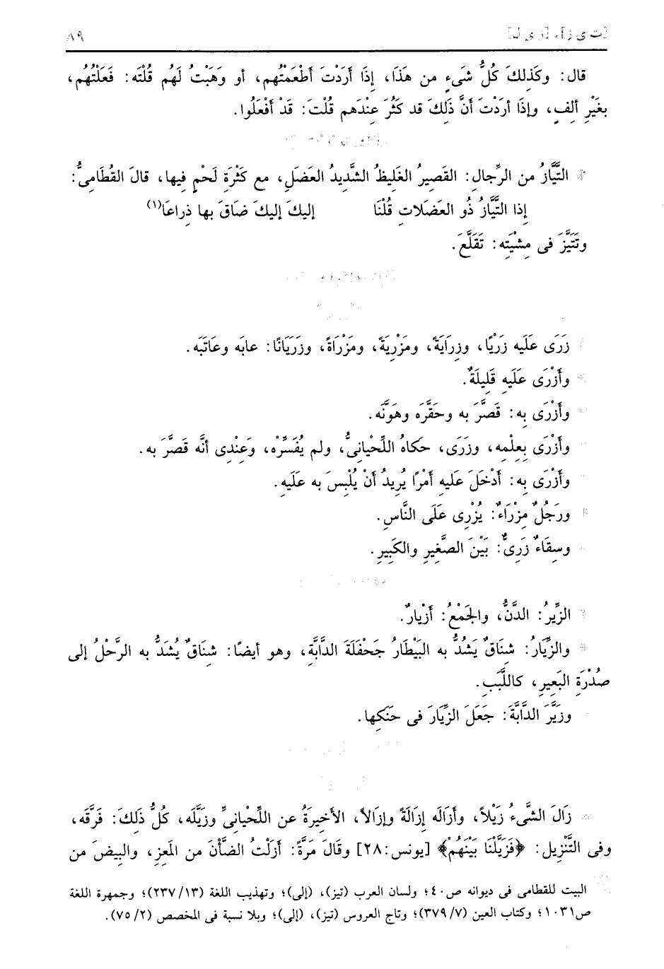 [ز ي ل] زَالَ الشًّيءُ زَيْلاً، وأَزَالَه إِزَالَةً وإزالاً، الأَخِيرَةُ عن اللِّحْيانِيِّ وزَيَّلَه، كُلُّ ذَلٍِ كَ: فَرَّقَه، وفي التَّنْزِيل: {فزيلنا بينهم} [يونس: 28] وقَالَ مَرَّةً: أَزَلْتُ الضَّأْنَ من المَعِزِ، والبِيضَ من