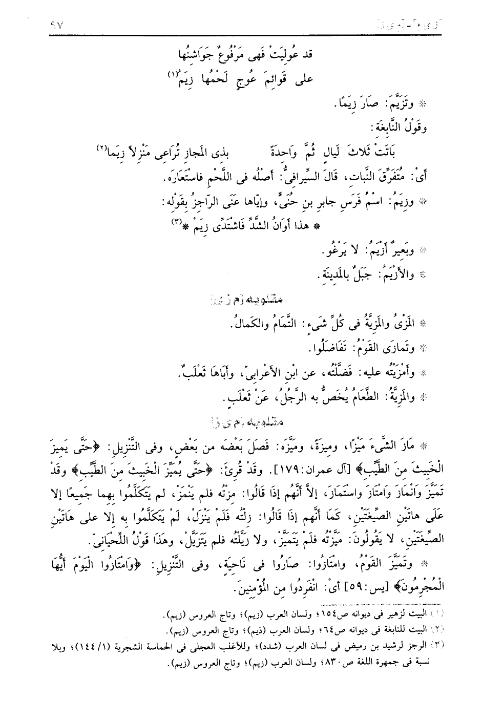 وتَزَيَّمَ: صَارَ زِيَماً. وقَوْلُ النَّابِغَة: