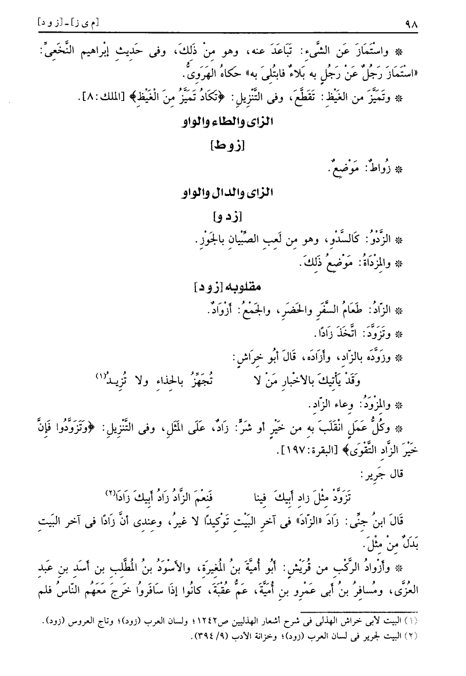 قَالَ ابنُ جِنِّي: زَادَ ((الزّادَ)) في آخرِ البَيْتِ تَوْكِيداً لا غيرُ، وعِندِي أنَّ زَاداً في آخر البَيتِ بَدَلٌ مِنْ مِثْلَ. وأَزْوادُ الرَّكْبِ من قُرَيْشٍ: أًَبُو أُميَّةَ بنُ المُغِيرَةِ، والأَسْوَدُ بنُ المُطَّلبِ بن أَسَدِ بنِ عَبدِ الغُزَّي، ومُسافِرُ بنُ أَبي عَمْرِو بنِ أُمَيَّةَ، عَمُّ عُقْبَةً، كانُوا إذَا سَافَرواً خَرجَ مَعَهُم النّاسُ فلم