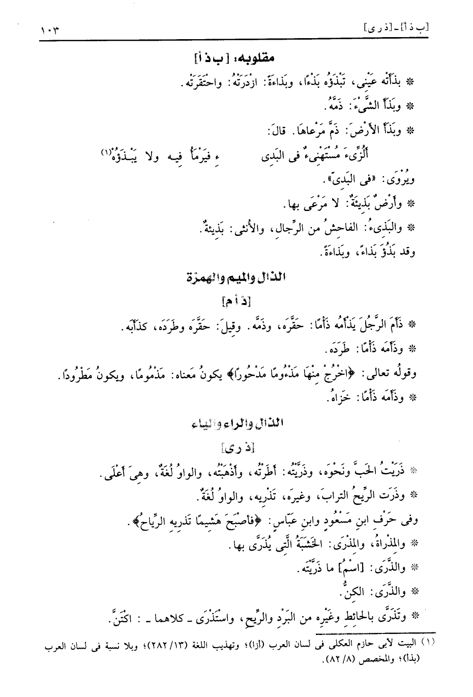[ب ذ أ] بَذَأَتْه عَيْنِي تَبْذَؤُه بَذْءًا وبَذاءَةً ازْدَرَتْهُ واحْتَقَرَتْه وبَذَاَ الشَّيْءَ ذَمَّهُ وبَذَأَ الأَرْضَ ذَمَّ مَرْعاهَا قالَ
