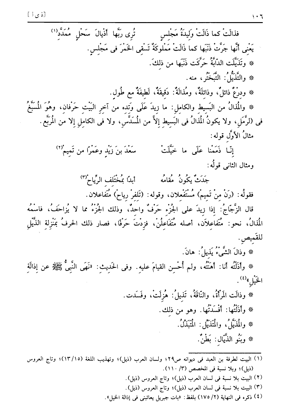 يَعْنِي أَنَّها جَرَّتْ ذَنَبَها كما ذَالَتْ مَمْلوكَةٌ تَسْقِي الخَمْرَ في مَجْلِسٍ وتَذَيَّلَت الدّابَّةُ حَرَّكَت ذَنَبَها من ذلِكَ والتَّذَيُّلُ التَّبَخْتُر منه ودِرْعٌ ذائلٌ وذائِلَةٌ ومُذالَةٌ دَقِيقَةٌ لَطِيفَةٌ مع طُولٍ والمُذالُ من البَسِيطِ والكامِلِ ما زِيدَ عَلَى وَتِدِه من آخِرِ البَيْتِ حَرْفانِ وُهَو المُسَبَّغُ في الرَّمَلِ ولا يكونُ المُذالُ في البَسِيطِ إِلاَّ من المُسَدَّسِ ولا في الكامِلِ إِلا من المُرَبًّع مثالُ الأَوَّلِ قوله
