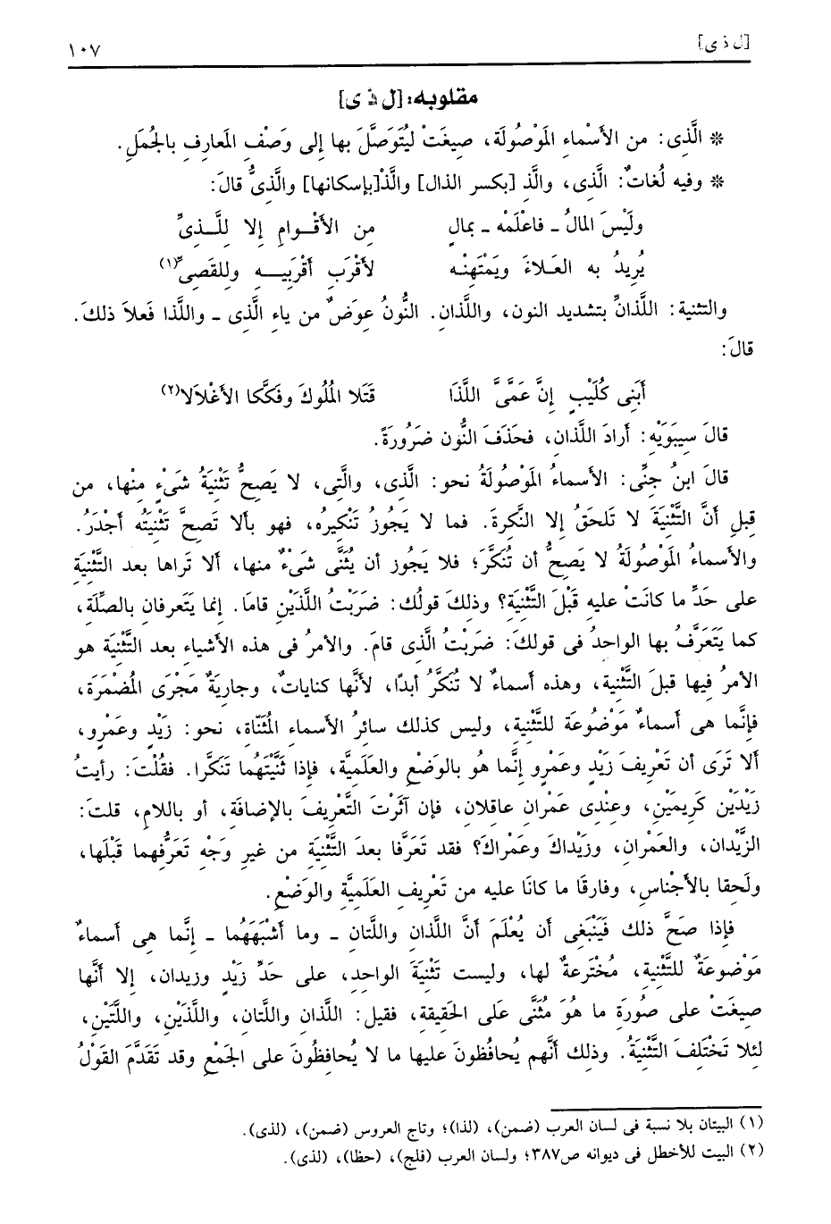 قالَ سِيبَوَيْهِ أَرادَ اللَّذانِ فحَذَفَ النُّون ضَرُورَةً قالَ ابنُ جِنِّي الأَسماءُ المَوْصُولَةُ نحو الَّذِي والَّتِي لا يَصِحُّ تَثْنِيَةُ شَيْءٍ مِنْها من قِبلِ أَنَّ التَّثْنِيَةَ لا تَلحَقُ إِلا النَّكِرةَ فما لا يَجُوزُ تَنْكِيرُه فهو بأَلا تَصِحَّ تَثْنِيَتُه أَجْدَرُ والأَسماءُ المَوْصُولَةُ لا يَصِحُّ أن تُنَكَّرَ فلا يَجُوز أن يُثَنَّى شَيْءٌ منها أَلا تَراها بعد التَّثْنِيَةِ على حَدٍّ ما كانَتْ عليهِ قَبْلَ التَّثْنِيَةِ وذلِكَ قولُك ضَرَبْتُ اللَّذَيْنِ قامَا إِنما يَتَعرفانِ بالصِّلَةِ كما يَتَعَرَّفُ بها الواحِدُ في قولكَ ضَربْتُ الَّذِي قامَ والأمرُ في هذه الأَشياءِ بعد التَّثْنِيَة هو الأمرُ فِيها قبلَ التَّثْنِية وهذه أَسماءٌ لا تُنَكَّرُ أبدًا لأَنَّها كناياتٌ وجارِيَةٌ مَجْرَى المُضْمَرَة فإِنَّما هي أَسماءٌ مَوْضُوعَة للتًّثْنِيةِ وليس كذلك سائِرُ الأَسماءِ المُثَنّاةِ نحو زَيْدٍ وعَمْرٍ وأَلا تَرَى أن تَعْرِيفَ زَيْدٍ وعَمْرٍ وإِنَّما هُو بالوَضْعِ والعَلَمِيَّة فإِذا ثَنَّيْتَهُما تَنَكَّرا فقُلْتَ رأيتُ زَيْدَيْن كَرِيمَيْنِ وعِنْدِي عَمْرانِ عاقِلانِ فإن آثَرْتَ التَّعْرِيفَ بالإضافَةِ أو باللامِ قلتَ الزَّيْدان والعَمْرانِ وزَيْداكَ وعَمْراكَ فقد تَعَرَّفا بعدَ التَّثْنِيَةِ من غيرِ وَجْهٍ تَعَرُّفِهما قَبْلَها وَلِحقا بالأَجْناسِ وفارقَا ما كانَا عليه من تَعْرِيفِ العَلَمِيَّةِ والوَضْعِ فإِذا صَحَّ ذلك فَيَنْبَغِي أَن يُعْلَمَ أَنَّ اللَّذانِ واللَّتانِ وما أَشْبَهَهُما إِنَّما هِي أَسماءٌ مَوْضوعَةٌ للتَّثْنِيةِ مُخْتَرعةٌ لها وليست تَثْنِيَةَ الواحِدِ على حَدِّ زَيْدٍ وزيدان إِلا أَنَّها صِيغَتْ على صُورَةِ ما هُوَ مثنى عَلى الحَقِيقةِ فقيل اللذَّانِ واللَّتانِ واللَّذَيْنِ واللَّتَيْنِ لِئلا تَخْتَلِفَ التَّثْنِيَةُ وذلِك أَنَّهم يُحافُظونَ عليها ما لا يُحافِظُونَ على الجَمْعِ وقد تَقَدَّمَ القَوْلُ