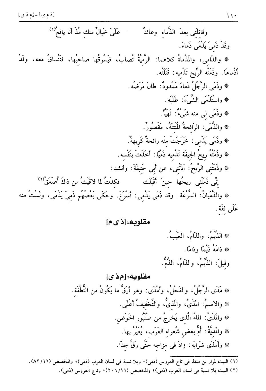 وقَدْ ذَمِيَ يَذْمَى ذَماءٌ والذّامِي والمَذْماةُ كلاهما الرَّمِيَّةُ تُصابُ فيَسُوقُها صاحِبُها فتَنْساقُ معه وقَدْ أَذْماهَا وذَمَتَهْ الرِّيحِ تَذْمِيه قَتَلَتْه وذَمَى الرَّجُلُ ذَماءٌ مَمْدودٌ طالَ مَرَضُه واسْتَذْمَى الشَّيْءَ طَلَبَه وذَمَى لِي منه شَيْءٌ تَهَيَّأَ والذَّمَى الرّائِحةُ المُنْتِنَةُ مَقْصُورٌ وذَمَى يَذْمِي خَرَجَتْ مِنْه رائحةٌ كَرِيهةٌ وذَمَتْهُ رِيحُ الجِيفَة تَذْمِيه ذَمْيًا أَخَذَتْ بنَفْسِه وذَمَتْنِي الرِّيحُ آذَتْنِي عن أَبِي حَنِيفَةَ وأنشد