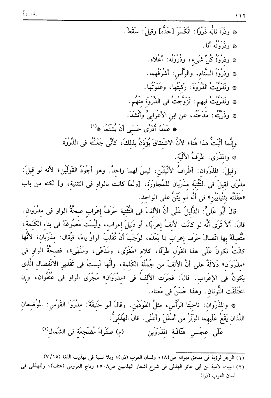 وإِنَّما أَثْبَتُّ هذا هُنا لأَنَّ الاشْتِقاقَ يُؤْذِنُ بذلِكَ كأَنِّي جَعَلْتُه في الذِّرْوَة والمِذْرَى طَرَفُ الأَلْيَةِ وقِيلَ المِذْرَوانِ أَطْرافُ الأَلْيَتَيْنِ ليسَ لهما واحِدٌ وهو أَجْوَدُ القَوْلَيْن لأَنه لو قِيلَ مِذْرَى لقِيلَ في التَّثْنِيَةِ مِذْرَيان للمُجاوَرَةِ ولَمَا كانت بالواوِ في التثنيةِ ولكنه من باب عَقَلْتُه بثِنْيايَيْنِ في أَنَّه لم يُثَنَّ على الواحِدِ قالَ أَبُو عَليٌّ الدَّلِيلُ عَلَى أَنَّ الأَلِفَ في التَّثْنِية حَرْفُ إِعْرابٍ صِحَّةُ الواو في مِذْرَوانِ قالَ أَلا تَرَى أَنَّه لو كانَت الأَلِفُ إِعرابًا أَو دَلِيلَ إِعرابٍ ولَيْسَت مَصُوغَةً في بناءِ الكَلِمةِ مُتَّصِلَةً بِها اتّصالَ حَرْف إِعرابٍ بما بَعْدَه لوَجَبَ أَنْ تُقْلبَ الواوُ ياءً فيُقال مِذْرَيانِ لأَنَّها كانَتْ تكونُ عَلَى هذا القَوْلِ طَرَفًا كلامِ مَغْزًى ومَدْعًى ومَلْهًى فصِحَّةُ الواوِ في مِذْرَوَانِ دَلالَةٌ على أَنَّ الأَلِفَ من جُمْلَةِ الكَلِمةِ وأَنَّها لَيستْ في تَقْديرِ الانْفِصالِ الَّذِي يكونُ في الإعْرابِ قالَ فجَرَت الأَلِفُ في مِذْرَوَانِ مَجْرَى الواو في عُنْفُوان وإِن اخْتَلَفَت النُّونانِ وهذا حَسَنٌ في مَعناه والمِذْرَوانِ ناحِيَتا الرَّأْسِ مثلُ الفَوْدَيْنِ وقالَ أَبو حَنِيفَةَ مِذْرَوَا القَوْسِ المَوْضِعانِ اللَّذانِ يَقَعُ عَلَيهِما الوَتَرُ من أَسْفَلَ وأَعْلَى قالَ الهُذَلِيُّ