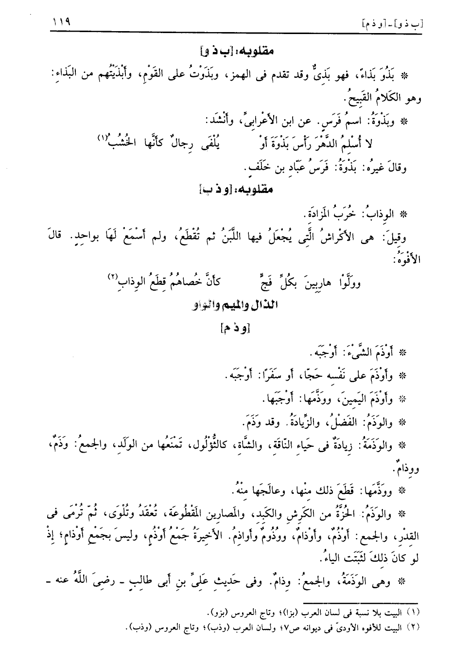 [وذ م] أَوْذَمَ الشًّيْءَ اَوْجَبَه وأَوْذَمَ على نَفْسِه حَجّا أَو سَفَرًا أَوْجَبَه وأَوْذَمَ اليَمِينَ ووَذَّمَها أَوْجَبَها والوَذَمُ الفَضْلُ والزِّيادَةُ وقد وَذَمَ والوَذَمَةُ زِيادَةٌ في حَياءِ النّاقَةٍ والشَّاةِ كالثُّؤْلُول تَمْنَعُها من الوَلَدِ والجمعُ وَذَمٌ ووِذامٌ ووَذَّمَها قَطَعَ ذلك مِنْها وعالَجَها مِنْهُ والوَذَمُ الحُزَّةُ من الكَرَشِ والكَبِدِ والمَصارِين المَقْطُوعَة تُعْقَدُ وتُلْوَى ثُمّ تُرْمَى في القِدْرِ والجمع أَوْذُمٌ وأَوْذامٌ ووُذُومٌ وأَواذِمُ الأَخِيرَةُ جَمْعُ أَوْذُمٍ وليسَ بجَمْعِ أَوْذامٍ إِذْ لو كانَ ذلِكَ لثَبَتَت الياءُ وهي الوَذَمَةُ والجمعُ وِذامٌ وفي حِدِيثِ عَلِيِّ بن أَبي طالِبٍ رضِيَ اللهُ عنه