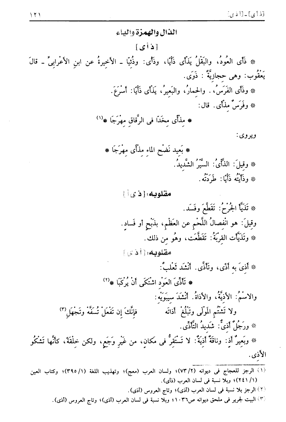 [ذ أي] ذَأَى العُودُ والبَقْلُ يَذْأَى ذَأْيًا وذَأْى وذُئْيًا الأَخِيرةُ عن ابنِ الأَعْرابِيِّ قالَ يَعْقُوب وهي حِجازِيَّةٌ ذَوَى وذَأَى الفَرَسُ والحِمارُ والبَعِيرُ يَذْأَى ذَأْيًا أَسْرَعَ وفَرَسٌ مِذْأَى قال