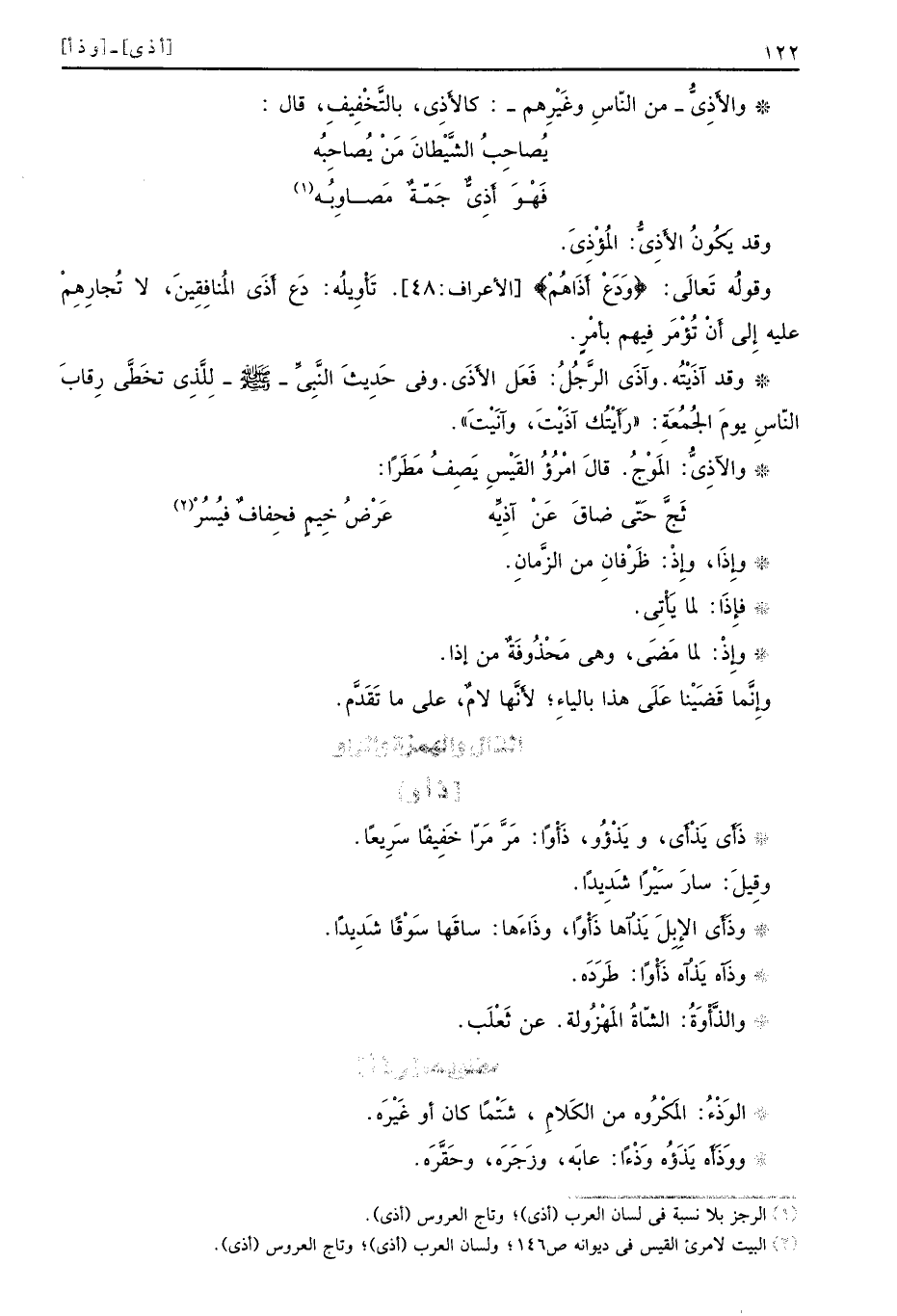 وقد يَكُونُ الأَذِيُّ المُؤْذِيَ وقولُه تَعالَى {ودع أذاهم} الأعراف 48 تأْوِيلُه دَع أَذَى المُنافِقِينَ لا تُجارِهِمْ عليه إِلى أَنْ تُؤْمَر فِيهم بأمْرٍ وقد آذَيْتُه وآذَى الرَّجُلُ فَعَل الأَذَى وفي حَدِيثَ النَّبِيِّ صلى الله عليه وسلم لِلَّذِي تَخَطَّى رِقابَ النّاسِ يومَ الجُمُعَةِ رَأَيْتُك آذَيْتَ وآنَيْتَ والآذِيُّ المَوْجُ قالَ امْرُؤُ القَيْسِ يَصِفُ مَطَرًا
