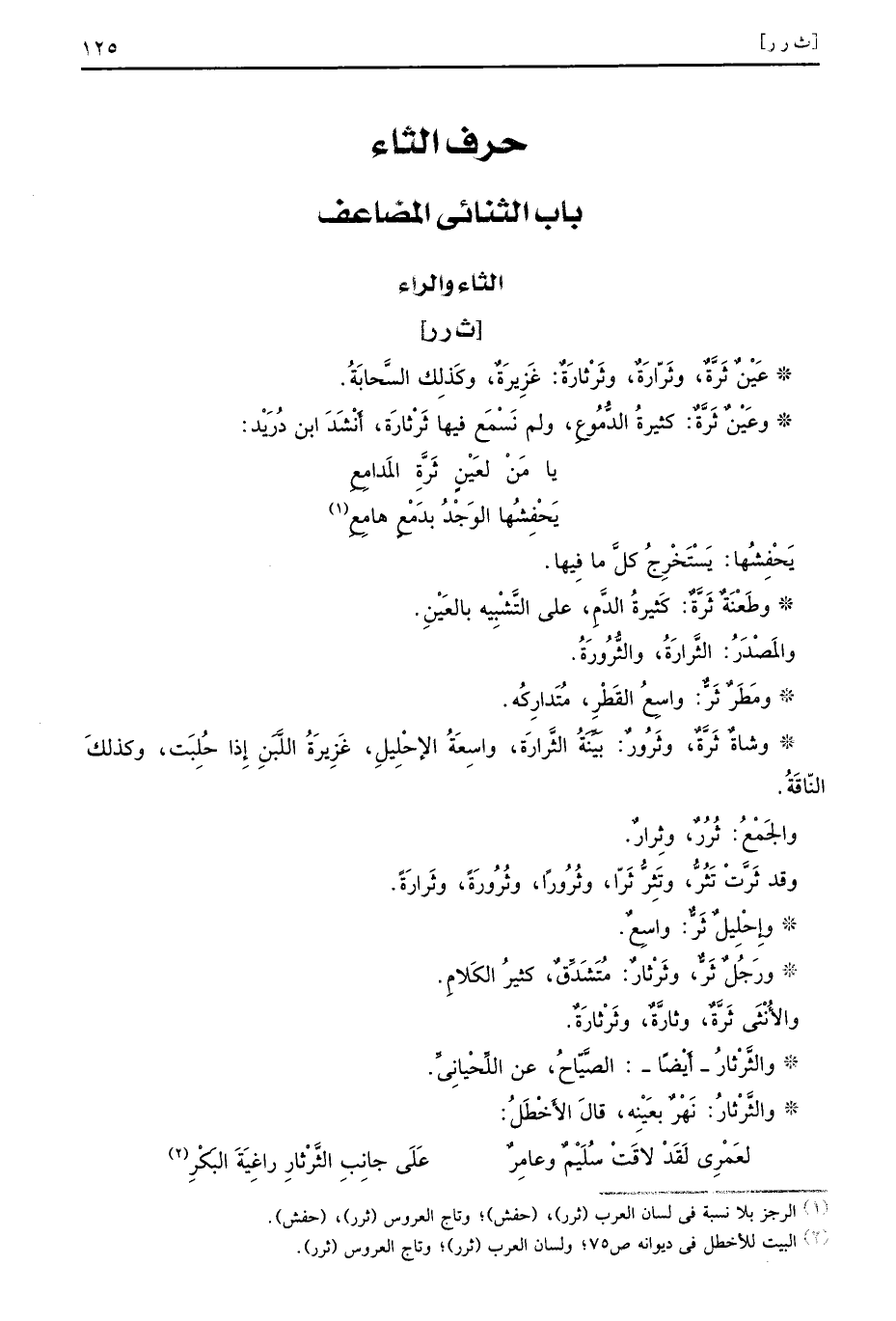 يَحْفِشُها يَسْتَخْرِجُ كلَّ ما فِيها وطَعْنَةٌ ثَرَّةٌ كَثيرةُ الدَّمِ على التَّشْبِيه بالعَيْنِ والمَصْدَرُ الثَّرارَةُ والثُّرُورَةُ ومَطَرٌ ثَرٌّ واسِعُ القَطْرِ مُتَدارِكُه وشاةٌ ثَرَّةٌ وثَرُورٌ بَيِّنَةُ الثَّرارَة واسِعَةُ الإحْلِيلِ غَرِيزَةُ اللَّبَنِ إِذا حُلِبَت وكذلكَ النّاقَةُ والجَمْعُ ثُرُرٌ وثِرارٌ وقد ثَرَّتْ تَثُرُّ وتَثِرٌّ ثَرّا وثُرُورًا وثُرُورَةً وثَرارَةً وإِحْلِيلٌ ثَرٌّ واسِعٌ ورَجُلٌ ثَرٌّ وثَرْثارٌ مُتَشَدِّقٌ كثيرُ الكَلامِ والأُنْثَى ثَرَّةٌ وثارَّةٌ وثَرْثارَةٌ والثَّرْثارُ أَيْضًا الصَّيَّاحُ عن اللِّحْيانِيُّ والثَّرْثارُ نَهْرٌ بعَيْنِه قالَ الأَخْطَلُ