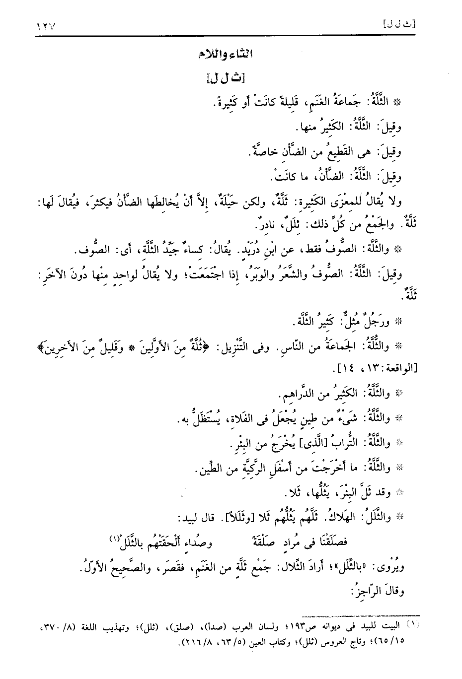 [ث ل ل] الثَّلَّةُ جَماعَةُ الغَنَمِ قَلِيلَةً كانَتْ أَو كَثِيرَةً وقِيلَ الثَّلَّةُ الكَثِيرُ منها وقِيلَ هي القِطِيعُ من الضَّأْنِ خاصَّةً وقِيلَ الثَّلَّةُ الضَّأْنُ ما كانَتْ ولا يُقالُ للمِعْزَى الكَثِيرةِ ثَلَّةٌ ولكن حَيْلَةٌ إِلاَّ أَنْ يُخالِطَها الضَّأْنُ فيكثرَ فيُقالَ لَها ثَلَّةٌ والجَمْعُ من كُلِّ ذلك ثِلَلٌ نادِرٌ والثَّلَّة الصُّوفُ فقط عن ابْنِ دُرَيْدٍ يُقالُ كِساءٌ جَيِّدُ الثَّلَّةِ أَي الصُّوف وقِيلَ الثَّلَّةُ الصُّوفُ والشَّعَرُ والوَبَرُ إِذا اجْتَمَعَتْ ولا يُقالُ لواحِدٍ مِنْها دُونَ الآخَرِ ثَلَّةٌ ورَجُلٌ مُثِلٌّ كَثِيرُ الثَّلَّة والثُّلَّةُ الجَماعَةُ من النّاسِ وفي التَّنْزِيل {ثلة من الأولين وقليل من الآخرين} الواقعة 13 14 والثَّلَّةُ الكَثِيرُ من الدَّراهِم والثَّلَّةُ شَيْءٌ من طِينٍ يُجْعَلُ في الفَلاةِ يُسْتَظَلُّ به والثَّلَّةُ التُّرابُ الَّذِي يُخْرَجُ من البِئْرِ والثَّلَّةُ ما أَخْرَجْتَ من أَسْفَلِ الرَّكِيَّةِ من الطَّين وقد ثَلَّ البِئْرَ يَثُلُّها ثَلا والثَّلَلُ الهَلاكُ ثَلَّهُم يَثُلُّهُم ثَلا وثَلَلاً قال لبيد