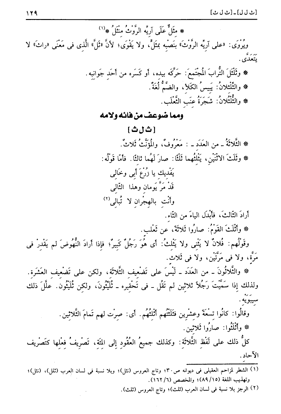 أَرادَ الثّالثَ فأَبْدَل الياءَ من الثّاءِ وأَثْلَثَ القَوْمُ صارُوا ثَلاثَةً عن ثَعْلَبٍ وقَوْلُهم فُلانٌ لا يَثْنِي ولا يَثْلِثُ أَي هُوَ رَجُلٌ كَبِيرٌ فإِذا أَرادَ النُّهُوضَ لم يَقْدِرْ في مَرَّةٍ ولا في مَرَّتَيْن ولا في ثَلاثٍ والثَّلاثُونَ من العَدَد لَيْسَ على تَضْعِيفِ الثَّلاثَةِ ولكن على تَضْعِيفِ العَشَرَةِ ولذلك إِذا سَمَّيْتَ رَجُلاً ثلاثِين لم تَقُل في تَحْقِيره ثُلَيِّثُونَ علَّلَ ذلك سِيبَوَيْهِ وقالُوا كانُوا تِسْعَةً وعِشْرِين فَثَلَثْتُهم أَثْلِثُهُم أَي صِرْت لهم تَمامَ الثًّلاثِين وأَثْلَثُوا صارُوا ثَلاثِين كلُّ ذلك على لَفْظِ الثَّلاثَةِ وكذلك جميعُ العُقُودِ إِلى المِئَةِ تَصْرِيفُ فِعْلِها كتَصْريف الآحادِ