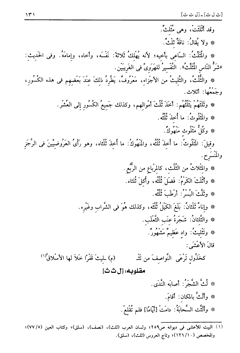 وقد أَثْلَثَتْ وهي مُثْلِثٌ ولا يُقالُ ناقَةٌ ثِلْثٌ والمُثَلِّثُ السّاعِي بأَخِيه لأنه يُهْلِكُ ثَلاثةً نَفْسَه وأَخاه وإِمَامَهُ وفي الحَدِيثِ شَرُّ النّاسِ المُثَلِّثُ التَّفْسِيرُ للهَرَوِيِّ في الغَرِيبَيْن والثُّلُثُ والثَّلِيثُ من الأَجْزاءِ مَعْرُوفٌ يَطَّرِدُ ذلِكَ عِنْدَ بَعْضِهِم في هذه الكُسُورِ وجَمْعُها أثلاث وثَلَثَهُمْ يَثْلُثُهُم أَخَذَ ثُلُثَ أَمْوالِهم وكذلك جَمِيعُ الكُسُورِ إِلى العُشْر والمَثْلُوثُ ما أُخِذَ ثُلُثُه وكُلُّ مَثْلُوثٍ مَنْهُوكٌ وقِيلَ المَثْلُوثُ ما أُخِذَ ثُلُثُه والمَنْهُوكُ ما أُخِذَ ثُلُثاه وهو رَأْيُ العَرُوضِيِّينَ في الرَّجَزِ والمَنْسَرِح والمِثلاثُ من الثُلُثِ كالمِرْباعِ من الرُّبُعِ وأَثْلَثَ الكَرْمُ فَضَلَ ثُلُثُه وأُكِلَ ثُلثاه وثَلَّثَ البُسْرُ أَرْطَب ثُلُثُه وإِناءٌ ثَلْثانٌ بَلَغَ الكَيْلُ ثُلُثَه وكذلك هُوَ في الشًّرابِ وغَيْرِه والثَّلِثانُ شَجَرَةُ عِنَبِ الثًّعْلَبِ وتَثْلِيثُ وادٍ عَظِيمٌ مَشْهُورٌ قالَ الأَعْشَى