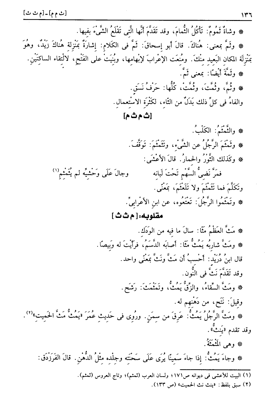 وشاةٌ ثَمُومٌ تَأْكُلُ الثُّمامَ وقد تَقَدَّمَ أَنَّها الَّتِي تَقْلَعُ الشَّيْءَ بفِيها وثَمَّ بمعنى هُناكَ قالَ أَبو إِسحاقَ ثَمَّ في الكَلامِ إِشارَةٌ بمَنْزِلةِ هُناكَ زَيْدٌ وهُوَ بمَنْزِلَة المكانِ البَعِيدِ مِنْكَ ومُنِعَت الإعْرابَ لإبْهامِها وبُنِيَتْ على الفَتْحِ لالْتِقاء الساكِنَيْنِ وثَمَّةَ أَيْضًا بمعنى ثَمَّ وثُمَّ وثُمَّتَ وثُمَّتْ كُلُّها حَرْفُ نَسَقٍ والفاءُ في كلِّ ذلك بَدَلٌ من الثّاءِ لكَثْرَةِ الاسْتِعمالِ [ث م ث م] والثَّمْثَمُ الكَلْبُ وثَمْثَمَ الرَّجُلُ عن الشَّيْءِ وتَثَمْثَمَ تَوَقَّفَ وكَذلك الثَّوْرُ والحِمارُ قالَ الأَعْشَى