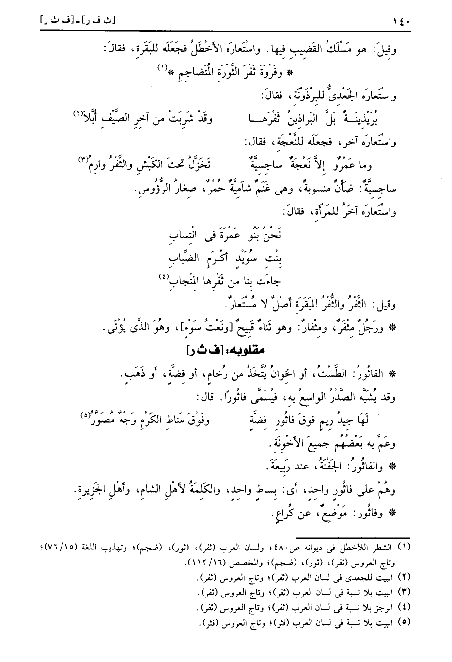 [ف ث ر] الفاثُور الطَّسْتُ أو الخِوانُ يُتَّخَذُ من رُخامٍ أو فِضَّةٍ أَو ذَهَبٍ وقد يُشَبَّه الصَّدْرُ الواسعُ بِه فيُسَمَّى فاثُورًا قال