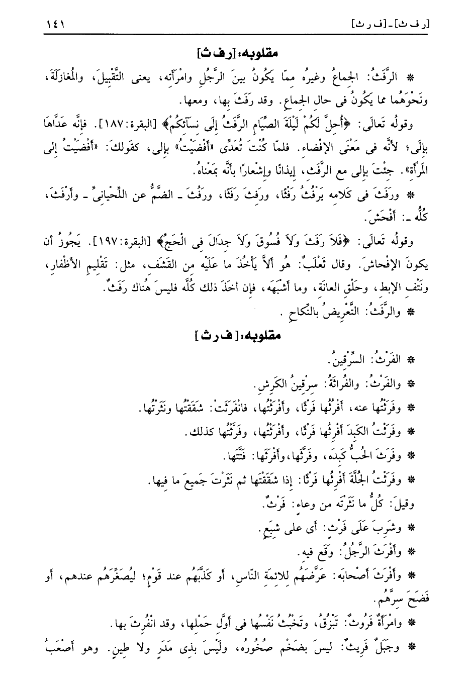 [ر ف ث] الرَّفَثُ الجِماعُ وغيرُه مِمّا يَكُونُ بينَ الرَّجُلِ وامْرَأَتِه يعني التَّقْبِيلَ والمُغازَلَةَ ونَحْوَهُما مما يَكُونُ في حالِ الجِماعِ وقد رَفَثَ بِها ومعها وقولُه تَعالَى {أحل لكم ليلة الصيام الرفث إلى نسائكم} البقرة 187 فإِنَّه عَدَّاهَا بإِلَى لأَنَّه في مَعْنَى الإفْضاءِ فلمّا كُنْتَ تُعَدِّي أَفْضَيْتُ بإِلى كقَولكَ أَفْضَيْتُ إِلى المَرْأَةِ جِئْتَ بإِلى مع الرًّفَثِ إِيذانًا وإِشْعارًا بأَنَّه بمَعْناهُ ورَفَثَ في كَلامِه يَرْفُثُ رَفْثًا ورَفِثَ رَفَثًا ورَفُثَ الضَّمُّ عن اللِّحْيانِيِّ وأَرْفَثَ كُلُّه أَفْحَشَ وقولُه تَعالَى {فلا رفث ولا فسوق ولا جدال في الحج} البقرة 197 يَجُوزُ أن يكونَ الإفْحاشَ وقال ثَعْلَبٌ هُو أَلاَّ يَأْخُذَ ما عَلَيْه مِن القَشَفِ مثل تَقْلِيمِ الأَظْفارِ ونَتْفِ الإِبطِ وحَلْقَ العانَةِ وما أَشْبَهَه فإِن أخَذَ ذلك كُلَّه فليسَ هُناك رَفَثٌ والرَّفَثُ التَّعْرِيضُ بالنِّكاحِ