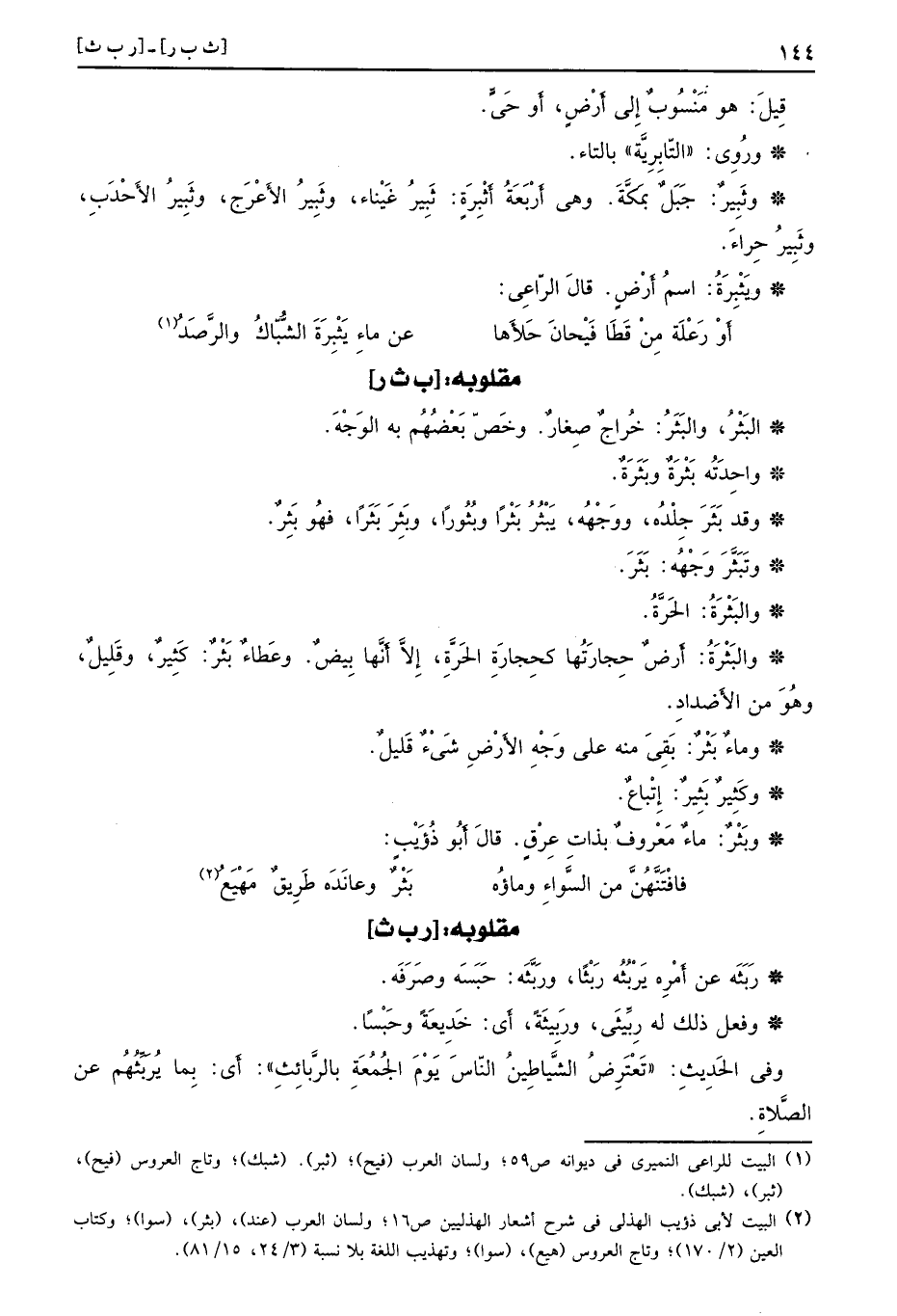 [ب ث ر] البَثْرُ والبَثَرُ خُراجٌ صِغارٌ وخَصّ بَعْضُهُم به الوَجْهَ واحِدَتُه بَثْرَةٌ وبَثَرَةٌ وقد بَثَرَ جِلْدُه ووَجْهُه يَبْثُرُ بَثْرًا وبُثُورًا وبَثِرَ بَثَرًا فهُو بَثِرٌ وتَبَثَّرَ وَجْهُه بَثَرَ والبَثْرَةُ الحَرَّةُ والبَثْرَةُ أَرضٌ حِجارَتُها كحِجارَةِ الحَرَّةِ إِلاَّ أَنَّها بِيضٌ وعَطاءٌ بَثْرٌ كَثِيرٌ وقَلِيلٌ وهُوَ من الأَضدادِ وماءٌ بَثْرٌ بَقِيَ منه على وَجْهِ الأَرْضِ شَيْءٌ قَليلٌ وكَثِيرٌ بَثِيرٌ إِتْباعٌ وبَثْرٌ ماءٌ مَعْروفٌ بذاتِ عِرْقٍ قالَ أَبُو ذُؤَيْبٍ