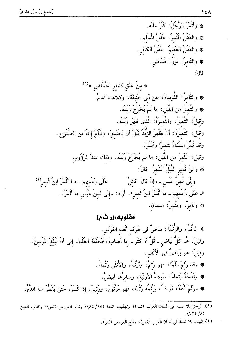 [ر ث م] الرَّثَمُ والرُّثْمَةُ بياضٌ في طَرَفِ أَنْفِ الفَرَسِ وقيلَ هُو كُلُّ بَياضٍ قَلَّ أو كَثُر إِذا أَصابَ الجَحْفَلَةَ العُلْيا إِلى أَنْ يَبْلُغَ المَرْسِنَ وقِيلَ هو بَياضٌ في الأَنْفِ وقد رَثِمَ رَثَمًا فهو رَثِمٌ وأَرْثَمُ والأُنْثَى رَثْماءُ ونَعْجَةٌ رَثْماءُ سَوداءُ الأَرْنَبَةِ وسائِرُها أبيضُ ورثَمَ أَنْفَهُ أو فاهُ يَرْثِمُه رَثْمًا فهو مَرْثُومٌ ورَثِيمٌ إِذا كَسَرَه حَتّى يَقْطُرَ منه الدَّمُ
