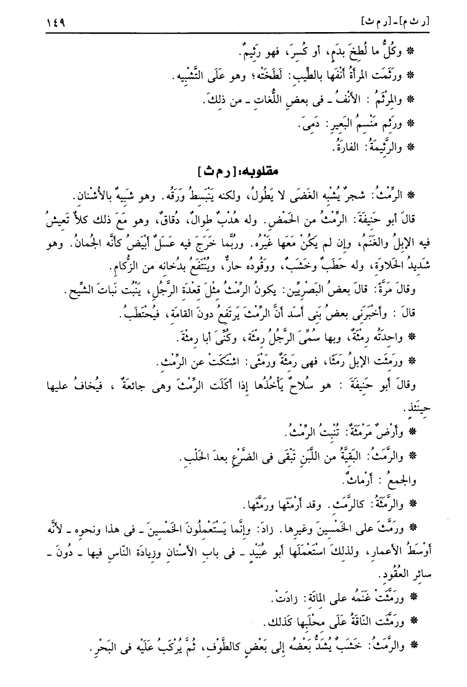 [ر م ث] الرَّمْثُ شجرٌ يُشْبِه الغَضَى لا يَطُولُ ولكنه يَنْبَسِطُ وَرَقُه وهو شَبِيهٌ بالأَشْنانِ قالَ أَبو حَنِيفَةَ الرِّمْثُ من الحَمْضِ وله هُدْبٌ طِوالٌ دُقاقٌ وهو مَعَ ذلك كلأٌ تَعِيشُ فيه الإِبلُ والغَنَمُ وإِن لم يَكُنْ مَعَها غَيْرُه ورُبَّما خَرَجَ فيه عَسَلٌ أَبْيضُ كأَنه الجُمانُ وهو شَدِيدُ الحَلاوَةِ وله حَطَبٌ وخَشَبٌ ووَقُودُه حارٌّ ويُنْتَفَعُ بدُخانِه من الزُّكامِ وقالَ مَرَّةً قالَ بعضُ البَصْرِيِّين يكونُ الرِّمْثُ مِثْلَ قِعْدَةِ الرَّجُلِ يَنْبُت نَباتَ الشِّيح قالَ وأَخْبَرَنِي بعضُ بَنِي أَسَد أَنَّ الرَّمْثَ يَرتَفِعُ دونَ القامَةِ فيُحْتَطَبُ واحِدَتُه رِمْثَةٌ وبها سُمِّيَ الرَّجُلُ رِمْثَة وكُنِّيَ أبا رِمْثَة ورَمِثَت الإبلُ رَمَثًا فهي رَمِثَةٌ ورَمْثَى اشْتَكَتْ عن الرِّمْثِ وقالَ أبو حَنِيفَةَ هو سُلاحٌ يَأْخُذُها إِذا أَكَلَت الرِّمْثَ وهي جائعَةٌ فيُخافُ عليها حِينَئِذٍ وأَرْضٌ مَرْمَثَةٌ تُنْبِتُ الرِّمْثُ والرَّمَثُ البَقِيَّةُ من اللَّبَنِ تَبْقَى في الضَّرْعِ بعدَ الحَلْبِ والجمعُ أَرْماثٌ والرَّمَثَةُ كالرَّمَثِ وقد أَرْمَثَها ورَمَّثَها ورَمَّثَ على الخَمْسِينَ وغيرِها زادَ وإِنَّما يَسْتَعْمِلُونَ الخَمْسِينَ في هذا ونحوِه لأَنَّه أَوْسَطُ الأَعمارِ ولذلِكَ اسْتَعْمَلَها أَبو عُبَيْدٍ في بابِ الأَسْنانِ وزِيادَة النّاسِ فيها دُونَ سائِر العُقُودِ ورَمَّثَتْ إَنَمَهُ على المِائَةِ زادَتْ ورَمَّثَت النّاقَةُ عَلَى مِحْلَبِها كَذلك والرَّمَثُ خَشَبٌ يُشَدُّ بَعْضُه إِلى بَعْضٍ كالطَّوْفِ ثُمَّ يُرْكَبُ عَلَيْهُ في البَحْرِ