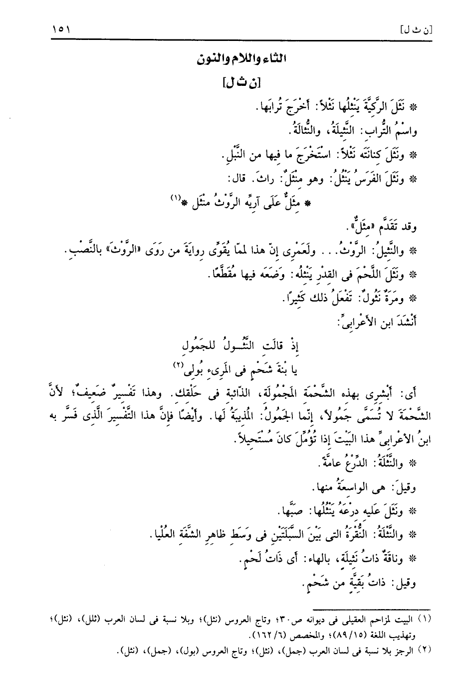 أَي أَبْشِرِي بهذِه الشَّحْمَةِ المَجْمُولَةِ الذّائبةِ في حَلْقِكِ وهذا تَفْسِيرٌ ضَعِيفٌ لأَنَّ الشَّحْمَةَ لا تُسَمَّى جَمُولاً إِنّما الجَمُولُ المُذِيبَةُ لَها وأَيْضًا فإِنَّ هذا التَّفْسِيرَ الَّذِي فَسَّر به ابنُ الأعْرابِيِّ هذا البَيْتَ إِذ تُؤُمِّلَ كانَ مُسْتَحِيلاً والنَّثْلَةُ الدِّرْعُ عامَّةً وقِيلَ هي الواسِعَةُ منها ونَثَلَ عَليهِ دِرْعَهُ يَنْثُلُها صَبَّها والنَّثَلَةُ النُّقْرَةُ التي بَيْنَ السَّبَلَتَيْنِ في وَسَطِ الشَّفَةِ العُلْيا وناقَةٌ ذاتُ نَثِيلَةٍ بالهاء أَي ذَاتُ لَحْمٍ وقيل ذاتُ بَقِيَّةٍ من شَحْمٍ