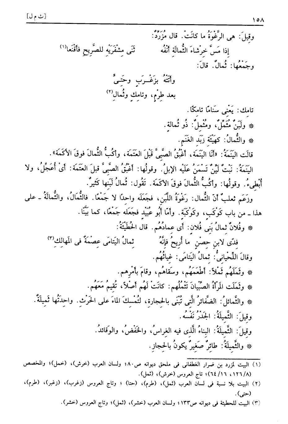 ثامِك يَعْنِي سَنامًا تامِكًا ولَبَنٌ مُثَمِّلٌ ومُثْمِلٌ ذُو ثُمالةٍ والثُّمالُ كهَيْئَةِ زَبَدِ الغَنَمِ قالَت اليَنَمَةُ أَنَا اليَنَمَة أَغْبُقُ الصَّبِيَّ قَبْلَ العَتَمَة وأكُبُّ الثُّمالَ فوقَ الأَكَمَة اليَنَمَةُ نَبْتٌ لَيِّنٌ تَسْمَنُ عَلَيْه الإبلُ وقولُها أَغْبُقُ الصَّبِيَّ قبلَ العَتَمَة أَيْ أُعَجِّلُ ولا أُبْطِئُ وقولُها وأكُبُّ الثُّمالَ فوقَ الأكَمَة تَقُول ثُمالُ لَبَنِها كَثِيرٌ وزَعَم ثعلبٌ أَنّ الثُّمال رَغْوَةُ اللَّبَنِ فجَعَلَه واحِدًا لا جَمْعًا فالثُّمَالُ والثُّمالَةُ على هذا من باب كَوْكَبٍ وكَوْكَبَةٍ وأَمّا أَبُو عُبَيْدٍ فجَعَله جَمْعًا كما بَيَّنّا وفُلانٌ ثِمالُ بَنِي فُلانٍ أَي عِمادُهُم قال الحُطَيْئَةُ