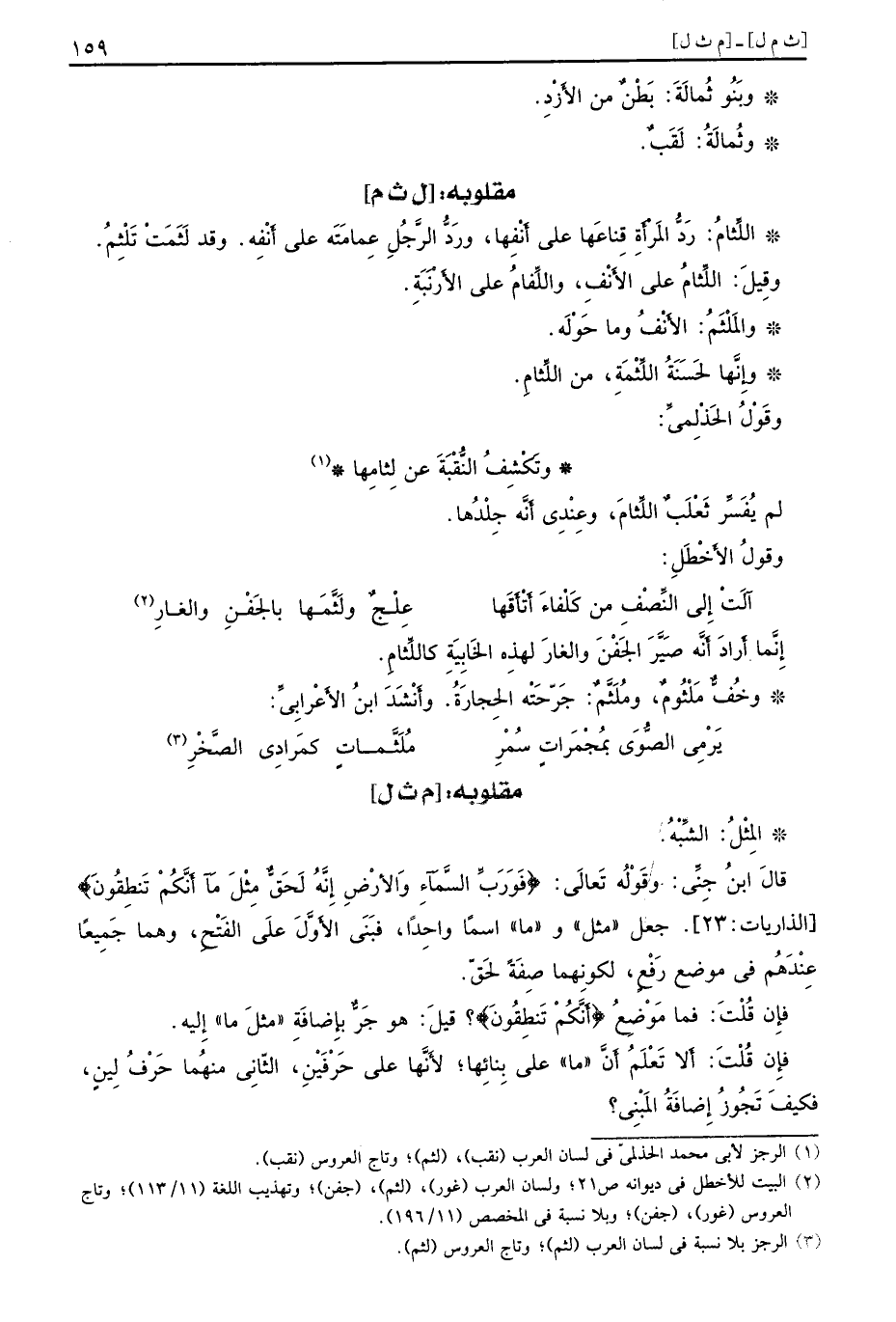 [م ث ل] المِثْلُ الشٍّ بْهُ قالَ ابنُ جِنِّي وقَوْلُه تَعالَى {فورب السماء والأرض إنه لحق مثل ما أنكم تنطقون} الذاريات 23 جعل مثل وما اسمًا واحِدًا فبَنَى الأوَّلَ علَى الفَتْحِ وهما جَمِيعًا عِنْدَهُم في موضع رَفْعٍ لكونِهما صِفَةً لحَقّ فإِن قُلْتَ فما مَوْضِعُ {أنكم تنطقون} قيلَ هو جَرٌّ بإِضافَةِ مثلَ ما إِليه فإِن قُلْتَ ألا تَعْلَمُ أَنَّ ما على بِنائِها لاَنَّها على حَرْفَيْنِ الثّانِي منهُما حَرْفُ لِينٍ فكيَف تَجُوزُ إِضافَةُ المَبْنِي