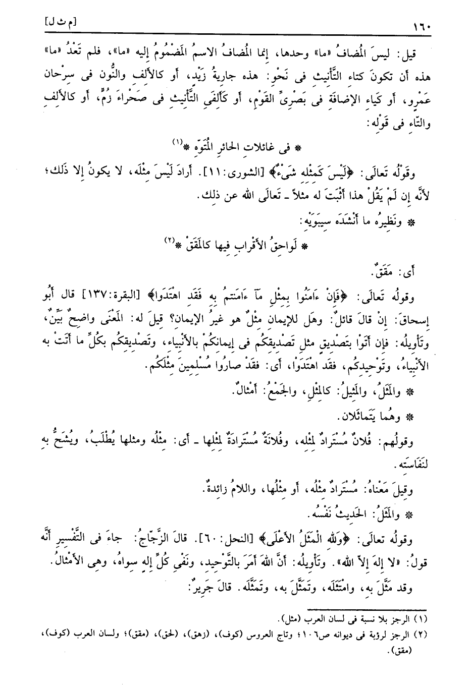 وقَوْلُه تَعالَى {لَيْسَ كَمِثْلِهِ شَيْءٌ} الشورى 11 أَرادَ لَيْسَ مِثْلَه لا يكونُ إِلا ذَلك لأنَّه إِن لَمْ يَقُلْ هذا أَثْبَتَ له مثلاً تَعالَى الله عن ذلِك ونَظِيرُه ما أَنْشَدَه سِيبَوَيْهِ