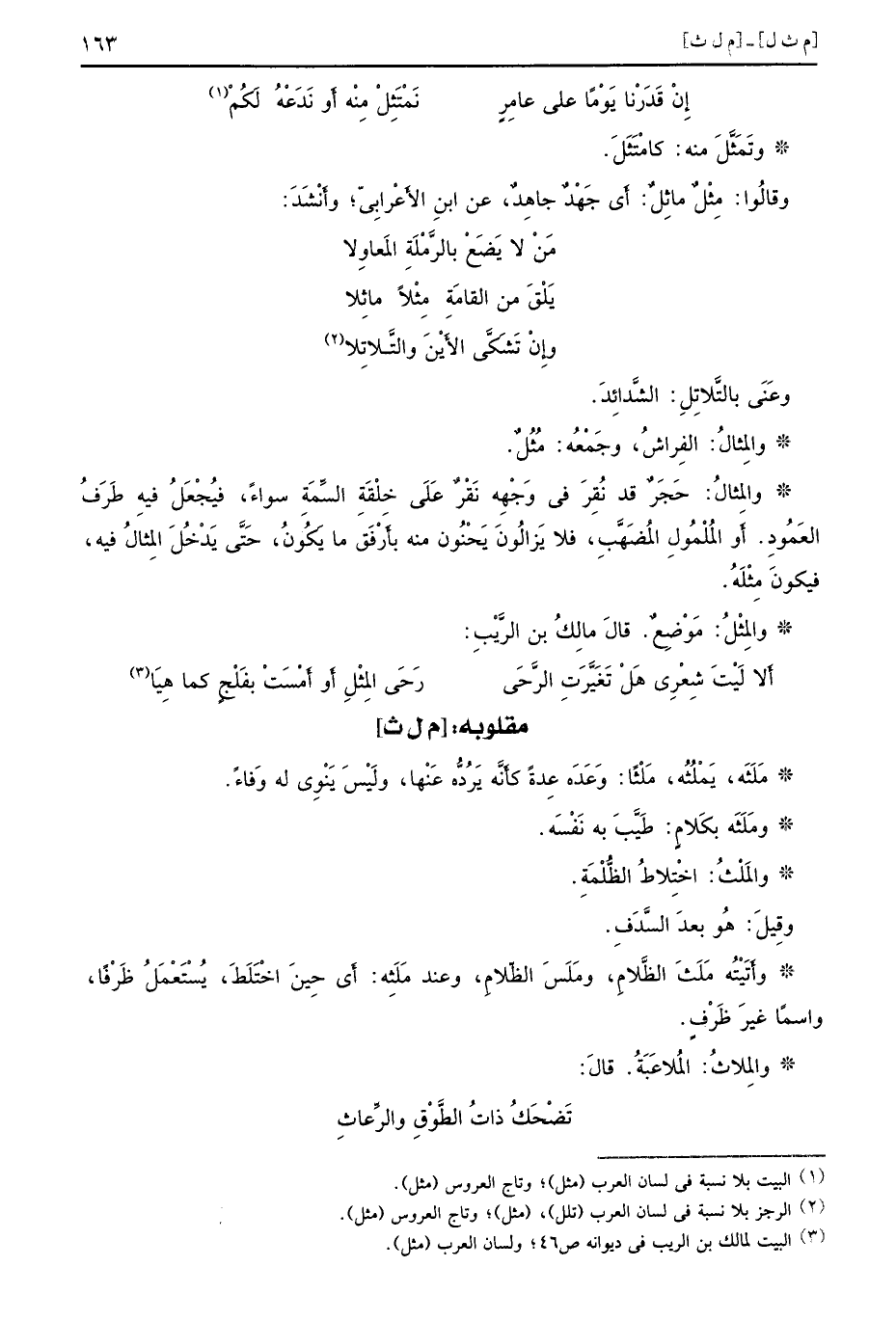وعَنَى بالتَّلاتِلِ الشَّدائِدَ والمِثالُ الفِراشُ وجَمْعُه مُثُلٌ والمِثالُ حَجَرٌ قد نُقِرَ في وَجْهِه نَقْرٌ عَلَى خِلْقَةِ السِّمَةِ سواءً فيُجْعَلُ فيهِ طَرَفٌ العَمُودِ أَو المُلْمُولِ المُضَهَّبِ فلا يَزالُونَ يَحْنُون منه بأَرْفَق ما يَكُونُ حَتَّى يَدْخُلَ المِثالُ فيه فيكونَ مِثْلَهُ والمِثْلُ مَوْضِعٌ قالَ مالِكُ بن الرَّيْبِ