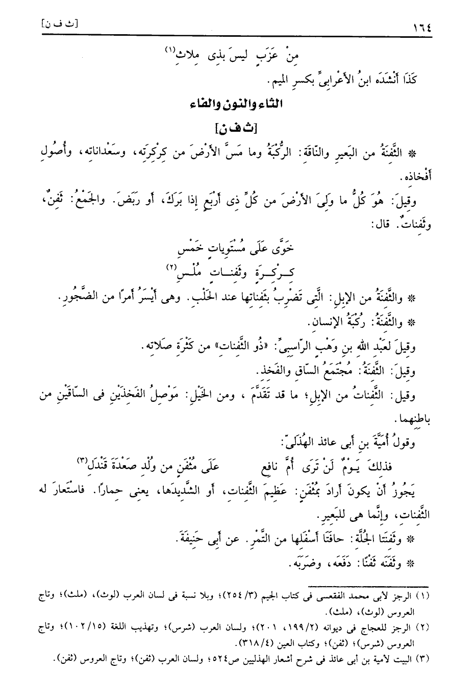 [ث ف ن] الثَّفِنَةُ من البَعيرِ والنّاقَةِ الرُّكْبَةُ وما مَسَّ الأَرْضَ من كِرْكِرِتَه وسَعْداناتِه وأُصُولِ أَفْخاذِه وقِيلَ هُوَ كُلُّ ما وَلِيَ الأَرْضَ من كُلِّ ذِي أَرْبَعٍ إِذا بَرَكَ أَو رَبَضَ والجَمْعُ ثَقِنٌ وثَفِناتٌ قال