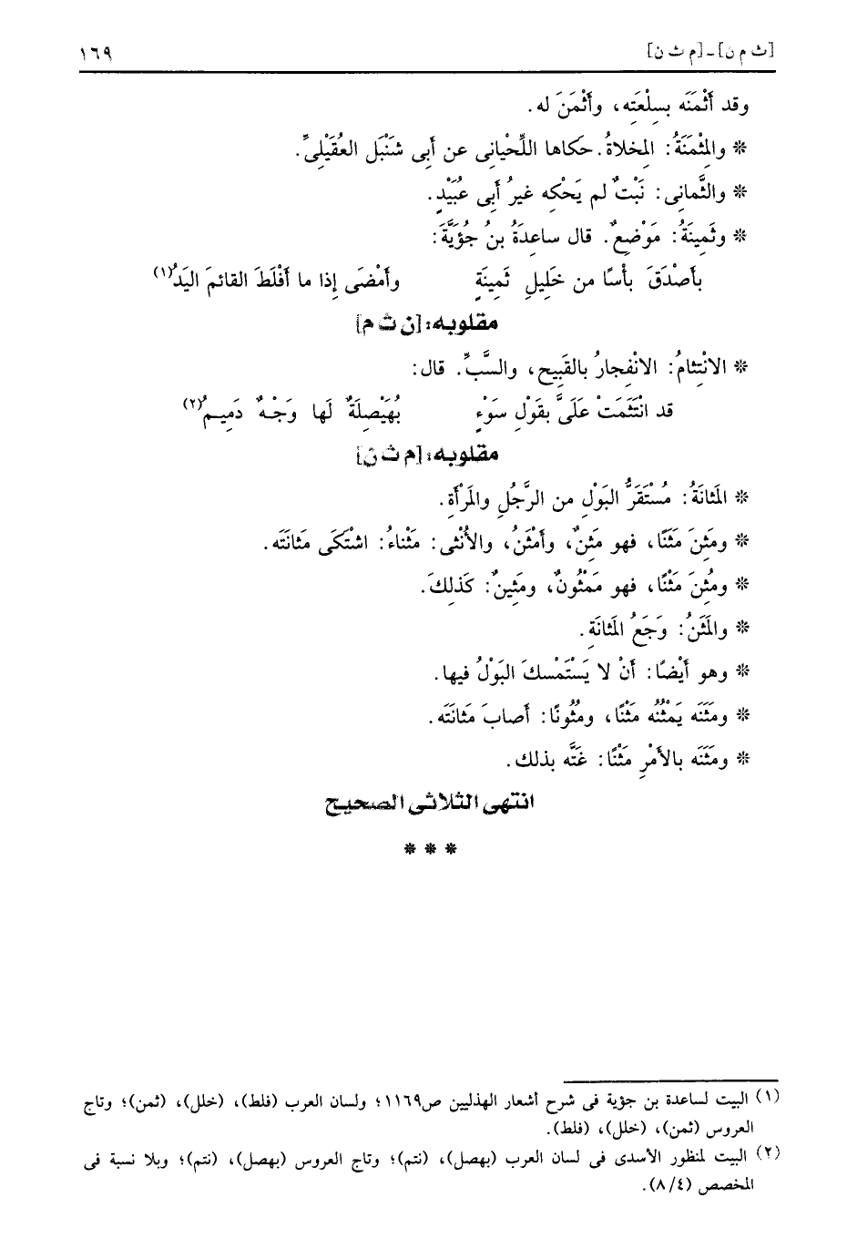[م ث ن] المَثانَةُ مُسْتَقَرُّ البَوْلِ من الرَّجُلِ والمَرْأَةِ ومَثِنَ مَثَنًا فهو مَثِنٌ وأَمْثَنُ والأُنْثَى مَثْناءُ اشْتَكَى مَثانَتَه ومُثِنَ مَثْنًا فهو مَمْثُونٌ ومَثِينٌ كَذلِكَ والمَثَنُ وَجَعُ المَثانَةِ وهو أَيْضًا أَنْ لا يَسْتَمْسكَ البَوْلُ فيها ومَثَنَه يَمْثُنُه مَثْنًا ومُثُونًا أَصابَ مَثانَتَه ومَثَنَه بالأمْرِ مَثْنًا غَتَّه بذلك انتهى الصحيح الثلاثي
