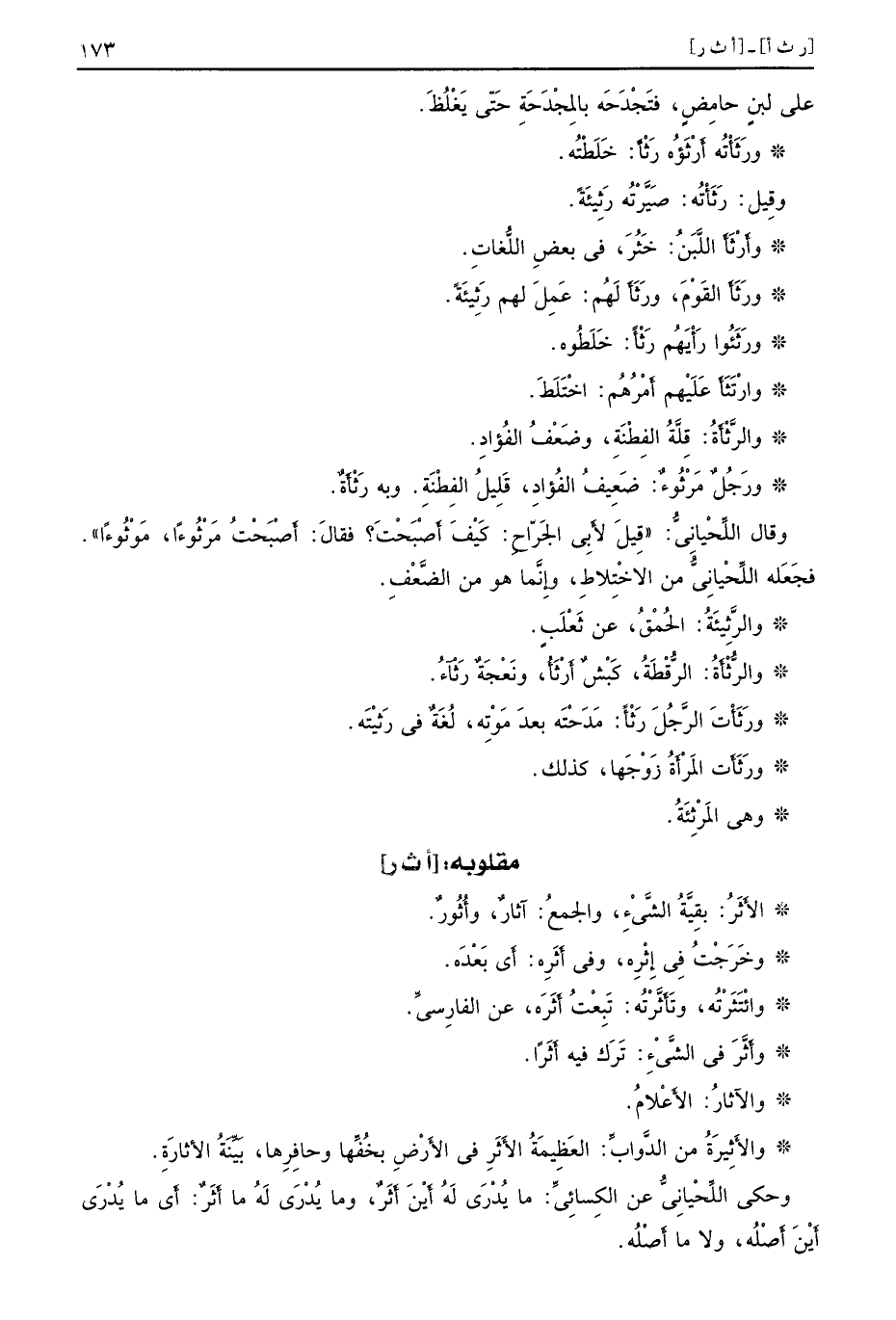 على لبنٍ حامِضٍ فتَجْدَحَه بالمِجْدَحَةِ حَتّى يَغْلُظَ ورَثَأْتُه أَرْثَؤُه رَثْأً خَلَطْتُه وقِيل رَثَأْتُه صَيًّرْتُه رَثِيئَةً وأَرْثَأَ اللَّبَنُ خَثُرَ وفي بعضِ اللُّغاتِ ورَثَأَ القَوْمَ ورَثَأَ لَهُم عَمِلَ لهم رَثِيئةً ورَثَئُوا رَأْيَهُم رَثْأً خَلَطُوه وارْتَثَأَ عَلَيْهم أَمْرُهُم اخْتَلَطَ والرَّثْأَةُ قِلَّةُ الفِطْنَةِ وضَعْفُ الفُؤادِ ورَجُلٌ مَرْثُوءٌ ضَعِيفُ الفُؤادِ قِلِيلُ الفِطْنَةِ وبه رَثْأَةٌ وقال اللِّحْيانِيُّ قِيلَ لأَبِي الجَرّاحِ كَيْفَ أَصْبَحْتَ فقالَ أَصْبَحْتُ مَرْثُوءًا مَوْثُوءًا فجَعَله اللٍّ حْيانِيُّ من الاخْتِلاطِ وإِنَّما هو من الضَّعْفِ والرَّثِيئَةُ الحُمْقُ عن ثَعْلَبٍ والرُّثْأَةُ الرُّقْطَةُ كَبْشٌ أَرْثَأُ ونَعْجَةٌ رَثْآءُ ورَثَأْتَ الرَّجُلَ رَثْأً مَدَحْتَه بعدَ مَوْتِه لُغَةٌ في رَثيتَه ورَثَأَت المَرْأَةُ زَوْجَها كذلك وهي المَرْثِئَةُ