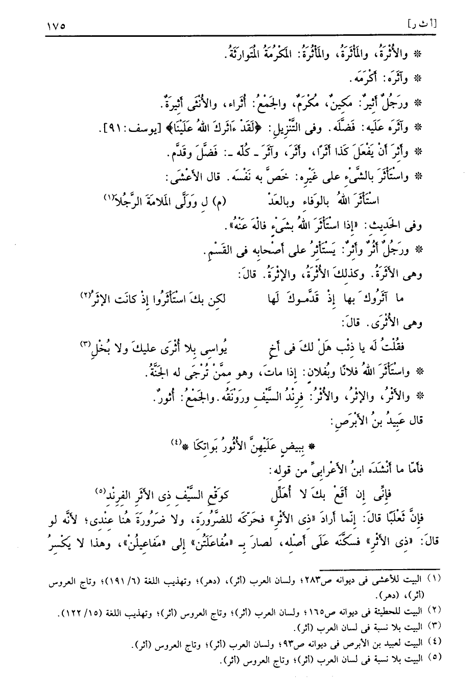 والأُثْرَةُ والمَأْثَرَةُ والمَأْثَرَةُ المَكْرُمَةُ المُتَوارَثَةُ وأَثَرَه أَكْرَمَه ورَجُلٌ أَثِيرٌ مَكِينٌ مُكْرَمٌ والجَمْعُ أُثَراء والأُنْثَى أَثِيرَةٌ وآثَرَه عَلَيه فَضَّلَه وفي التَّنْزِيلِ {لَقَدْءَاثَركَ اللهُ عَلَيْنَا} يوسف 91 وأَثِرَ أَنْ يَفْعَلَ كَذا أَثَرًا وأَثَرَ وآثَرَ كُلِّه فَضَّلَ وقَدَّم واسْتَاْثَرَ بالشَّيْءِ على غَيْرِه خَصَّ به نَفْسَه قال الأَعْشَى