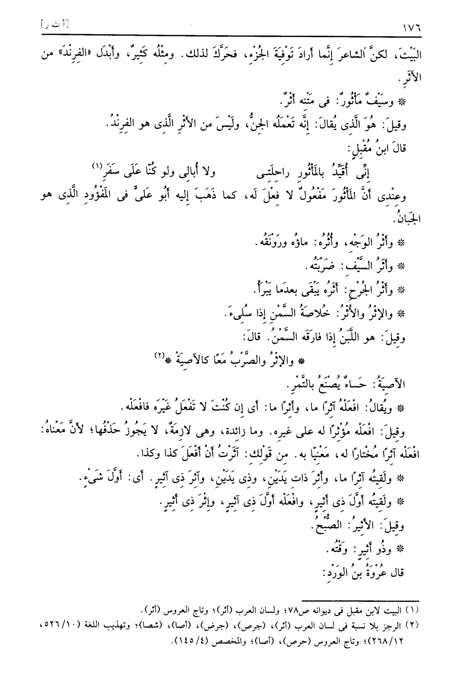 وعِنْدِي أَنَّ المَأْثُورَ مَفْعُولٌ لا فِعْلَ لَه كما ذَهَبَ إِليه أَبُو عَليٍّ في المَفْؤُودِ الَّذِي هو الجَبانُ وأَثَرُ الوَجْهِ وأُثُرُه ماؤُه ورَوْنَقُه وأَثَرُ السَّيْفِ ضَرْبَتُه وأَثْرُ الجُرْحِ أَثَرُه يَبْقَى بعدَما يَبْرَأُ والإثْرُ والأُثْرُ خُلاصَةُ السَّمْنِ إِذا سُلِئَ وقِيلَ هو اللَّبَنُ إِذا فارَقَه السَّمْنُ قالَ