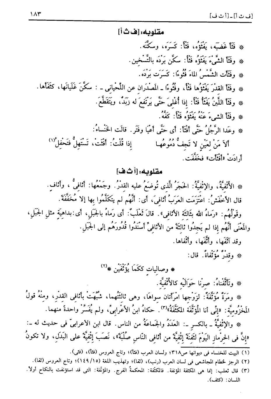 [ف ث أ] فَثَأَ غَضَبَه يَفْثَؤُه فَثْأً كَسَرَه وسَكَّنَه وفَثَأَ الشَّيْءَ يَفْثَؤُه فَثْأً سَكَّن بَرْدَه بالتَّسْخِين وفَثَأَت الشَّمْسُ الماءَ فُثُوءًا كَسَرَت بَرْدَه وفَثَأَ القِدْرَ يَفْثَؤُها فثأ وفُثُوءًا المَصْدَرانِ عن اللِّحْيانِي سَكَّنَ غَلَيانَها كَثَفَأَها وفَثَأَ اللَّبنُ يَفْثَأُ فَثْأً إِذا أُغْلِيَ حَتَّى يَرْتَفِعَ له زَبَدٌ ويَتَقَطَّعَ وفَثَأَ الشيءَ عَنْهُ يَفْثَؤُه فَثْأً كَفَّهُ وعَدا الرَّجُلُ حَتَّى أَفْثَأَ أَي حَتَّى أَعْيَا وفَتَر قالَت الخَنْساءُ