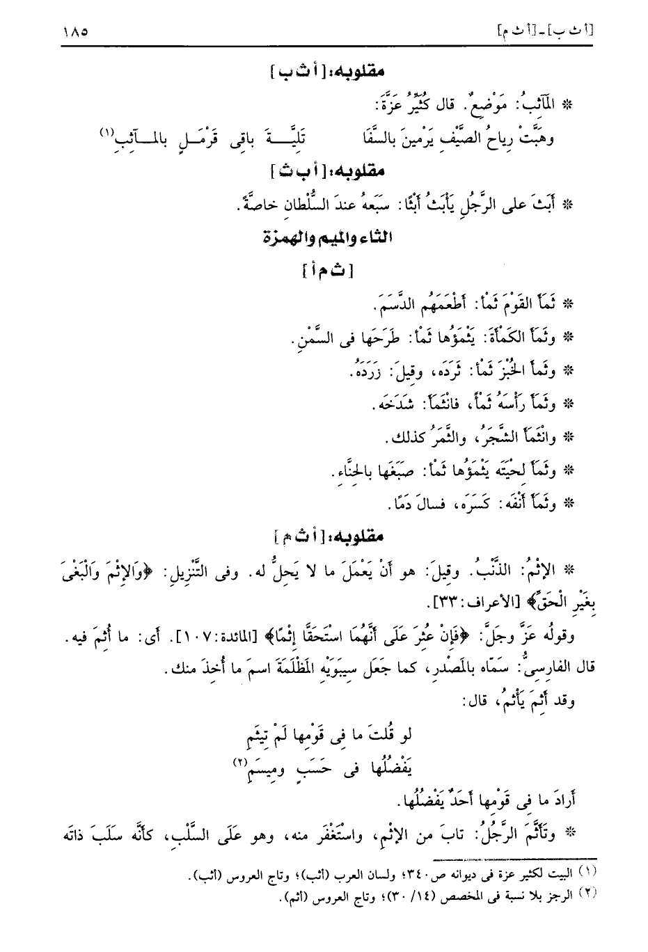 [أث م] الإِثْمُ الذَّنْبُ وقِيلَ هو أَنْ يَعْمَلَ ما لا يَحِلُّ له وفي التَّنْزِيلِ {والإثم والبغي بغير الحق} الأعراف 33 وقولُه عَزَّ وجَلَّ {فإن عثر على أنهما استحقا إثما} المائدة 107 أَي ما أُثِمَ فيه قال الفارِسِيُّ سَمّاه بالمَصْدرِ كما جَعَل سِيبَوَيْهِ المَظْلَمَةَ اسمَ ما أُخِذَ منك وقد أَثِمَ يَأْثمُ قال