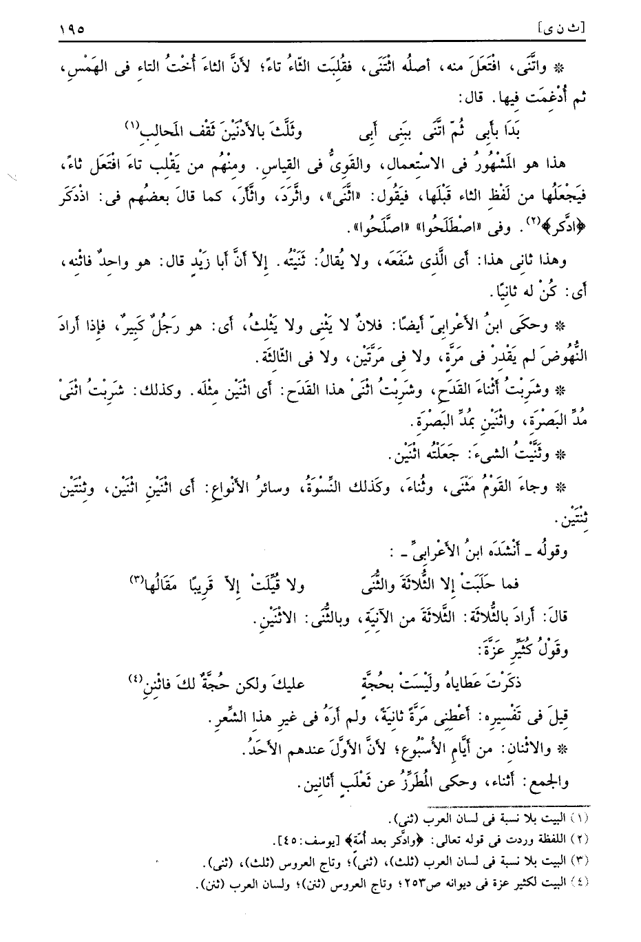 هذا هو المَشْهُورُ في الاسْتِعمالِ والقَوِيُّ في القِياسِ ومِنْهُم من يَقْلِب تاءَ افْتَعَل ثاءً فيَجْعَلُها من لَفْظِ الثاء قَبْلَها فيَقُول اثَّنَى واثَّرَدَ واثَّأَرَ كما قالَ بعضُهم في اذْدَكَر {ادكر} وفي اصْطَلَحُوا اصَّلَحُوا وهذا ثانِي هذا أَي الَّذِي شَفَعَه ولا يُقالُ ثَنَيْتُه إِلاّ أَنَّ أَبا زَيْدٍ قال هو واحِدٌ فاثْنِه أَي كُنْ له ثانِيًا وحكَى ابنُ الأَعْرابِيّ أَيضًا فلانٌ لا يَثْنِي ولا يَثْلِثُ أَي هو رَجُلٌ كَبِيرٌ فإِذا أَرادَ النُّهُوضَ لم يَقْدِرْ في مَرَّةٍ ولا فِي مَرَّتَيْن ولا في الثّالِثَة وشَرِبْتُ أَثْناءَ القَدَحِ وشَرِبْتُ اثْنَيْ هذا القَدَح أَي اثْنَيْن مِثْلَه وكذلك شَرِبْتُ اثْنَيْ مُدِّ البَصْرَةِ واثْنَيْنِ بمُدِّ البَصْرَةِ وثَنَّيْتُ الشيءَ جَعَلْتُه اثْنَيْن وجاءَ القَوْمُ مَثَنَى وثُناءَ وكَذلك النِّسْوَةُ وسائرُ الأَنْواعِ أَي اثْنَيْنِ اثْنَيْن وثِنْتَيْن ثِنْتَيْن وقولُه أَنْشَدَه ابنُ الأَعْرابِيِّ