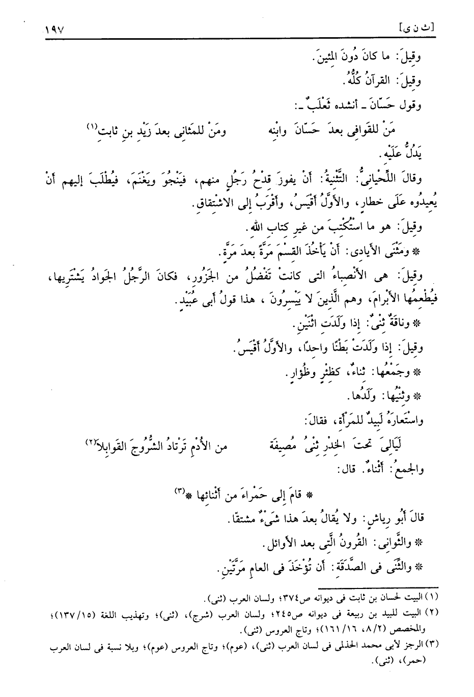 يَدُلُّ عَلَيْهِ وقالَ اللِّحْيانِيُّ التَّثْنِيةُ أَنْ يفوزَ قِدْحُ رَجُلٍ منهم فيَنْجُوَ ويَغْنَمَ فيُطْلَبَ إليهم أَنْ يُعِيدُوه عَلَى خطارٍ والأَوَّلُ أَقْيَسُ وأَقْرَبُ إِلى الاشْتِقاقِ وقِيلَ هو ما اسْتُكْتِبَ من غيرِ كِتابِ اللهِ ومَثْنَى الأَيادِي أَنْ يَأْخُذَ القِسْمَ مَرَّةً بعدَ مَرَّةٍ وقِيلَ هي الأنْصِباءُ التي كانتْ تَفْضُلُ من الجَزُورِ فكانَ الرَّجُلُ الجَوادُ يَشْتَرِيها فيُطْعِمُها الأَبْرامَ وهم الَّذِينَ لا يَيْسِرُونَ هذا قولُ أَبي عُبَيْدٍ وناقَةٌ ثِنْيٌ إِذا وَلَدَتِ اثْنَينِ وقِيلَ إِذا وَلَدَتْ بَطْنًا واحِدًا والأَوَّلُ أَقْيَسُ وجَمْعُها ثِناءٌ كظِئْرٌ وظُؤارٍ وثِنْيُها وَلَدُها واسْتَعارَهُ لَبِيدٌ للمَرْأَةِ فقالَ