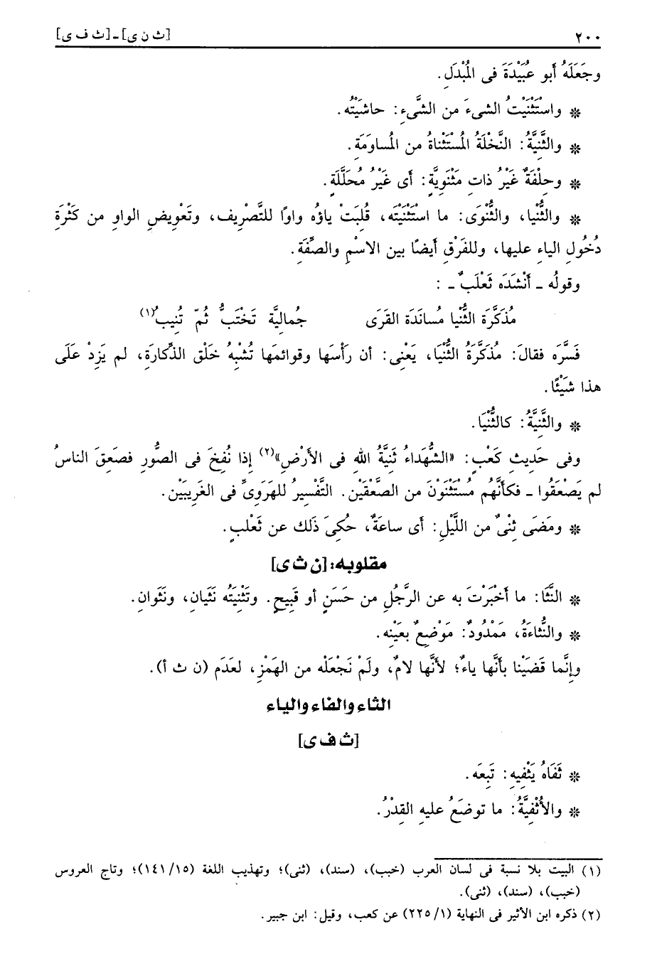 وجَعَلَهُ أَبو عُبَيدَةَ في المُبْدَلِ واسْتَثْنَيْتُ الشيءَ من الشَّيءِ حاشَيْتُه والثَّنِيَّةُ النَّخْلَةُ المُسْتَثْناةُ من المُساوَمَةِ وحِلْفَةٌ غَيْرُ ذاتِ مَثْنَوِيَّةٍ أَي غَيْرُ مُحَلَّلَةٍ والثُّنْيا والثُّنْوَى ما اسْتَثْنَيْتَه قُلِبَتْ ياؤُه واوًا للتَّصْرِيف وتَعْوِيضِ الواوِ من كَثْرَةِ دُخُولِ الياءِ عليها وللفَرْقِ أَيضًا بين الاسْمِ والصِّفَةِ وقولُه أَنْشَدَه ثَعْلَبٌ