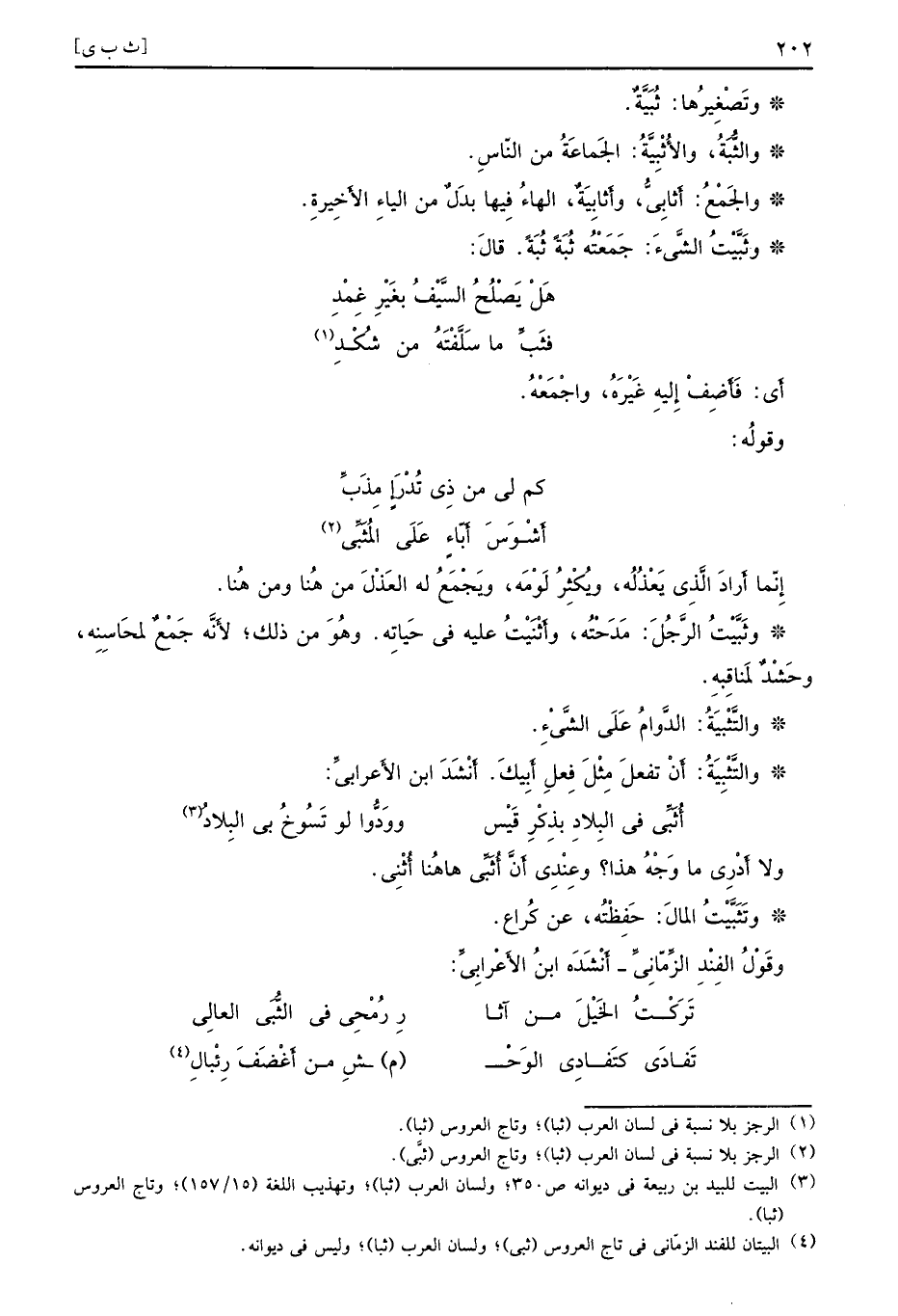 ولا أَدْرِي ما وَجْهُ هذا وعِنْدِي أَنَّ أُثَبِّي هاهُنا أُثْنِي وتَثَبَّيتُ المالَ حَفِظْتُه عن كُراع وقَوْلُ الفِنْدِ الزِّمانِيِّ أَنْشَدَه ابنُ الأَعْرابِيِّ