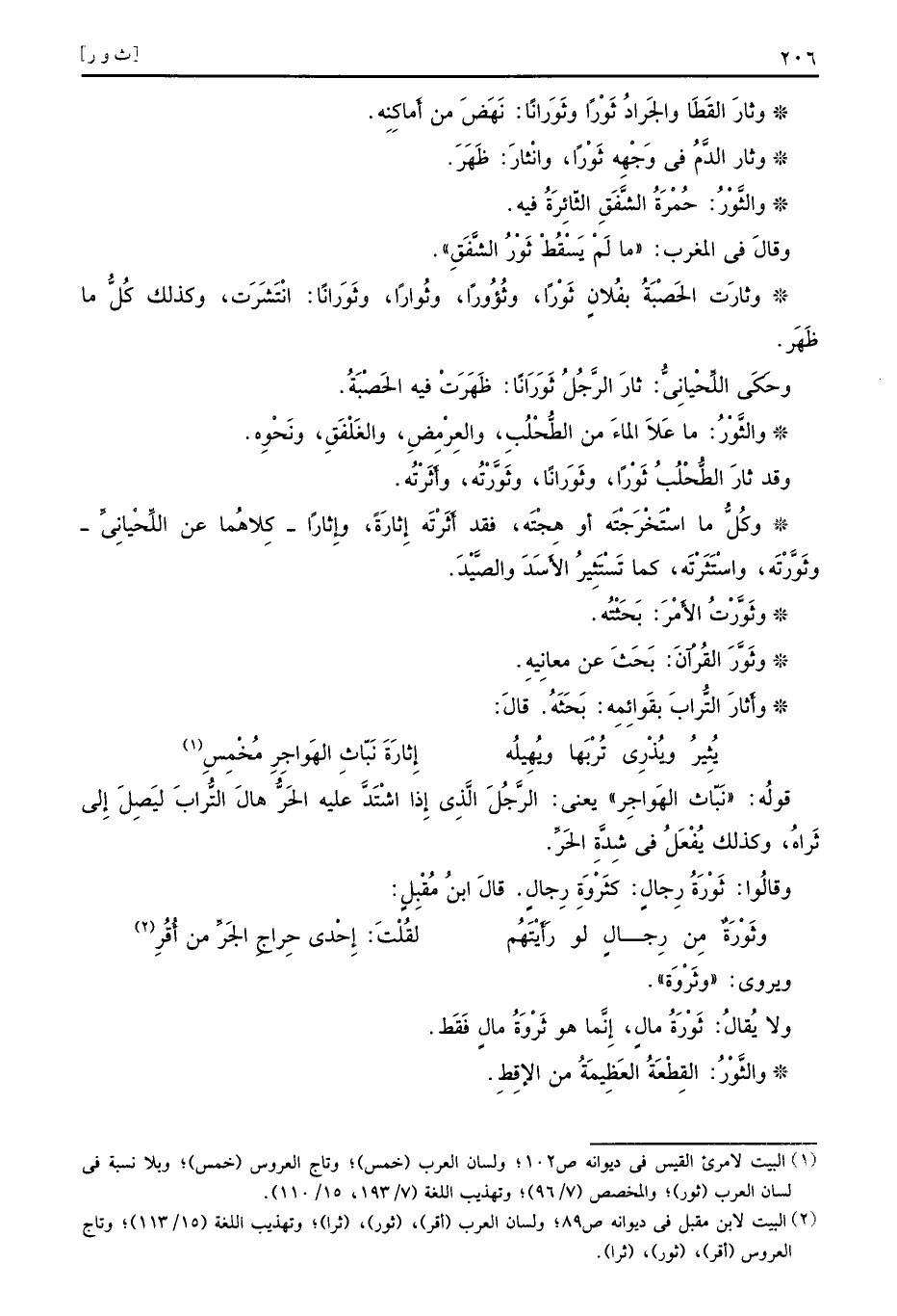 وثارَ القَطَا والجَرادُ ثَوْرًا وثَوَرانًا نَهَضَ من أماكِنِه وثار الدَّمُ في وَجْهِه ثَوْرًا وانْثارَ ظَهَرَ والثَّوْرُ حُمْرَةُ الشَّفَقِ الثّائِرَةُ فيه وقالَ في المغرب ما لَمْ يَسْقُطْ ثَوْرُ الشَّفَقِ وثارَت الحَصْبَةُ بفُلانٍ ثَوْرًا وثُؤُورًا وثُوارًا وثَوَرانًا انْتَشَرَت وكذلك كُلُّ ما ظَهَر وحَكَى اللِّحْيانِيُّ ثارَ الرَّجُلُ ثَوَرانًا ظَهَرَتْ فيه الحَصْبَةُ والثَّوْرُ ما عَلاَ الماءَ من الطُّحْلُبِ والعِرْمَضِ والغَلْفَقِ ونَحْوِه وقد ثارَ الطُّحْلُبُ ثَوْرًا وثَوَرانًا وثَوَّرْتُه وأَثَرْتُه وكُلُّ ما اسْتَخْرَجْتَه أو هِجْتَه فقد أَثَرْتَه إِثارَةً وإِثارًا كِلاهُما عن اللِّحْيانِيِّ وثَوَّرْتَه واسْتَثَرْتَه كما تَسْتَثِيرُ الأَسَدَ والصَّيْدَ وثَوَّرْتُ الأَمْرَ بَحْثْتُه وثَوَّرَ القُرْآنَ بَحَثَ عن معانِيهِ وأَثارَ التُّرابَ بقَوائِمِه بَحَثَهُ قالَ