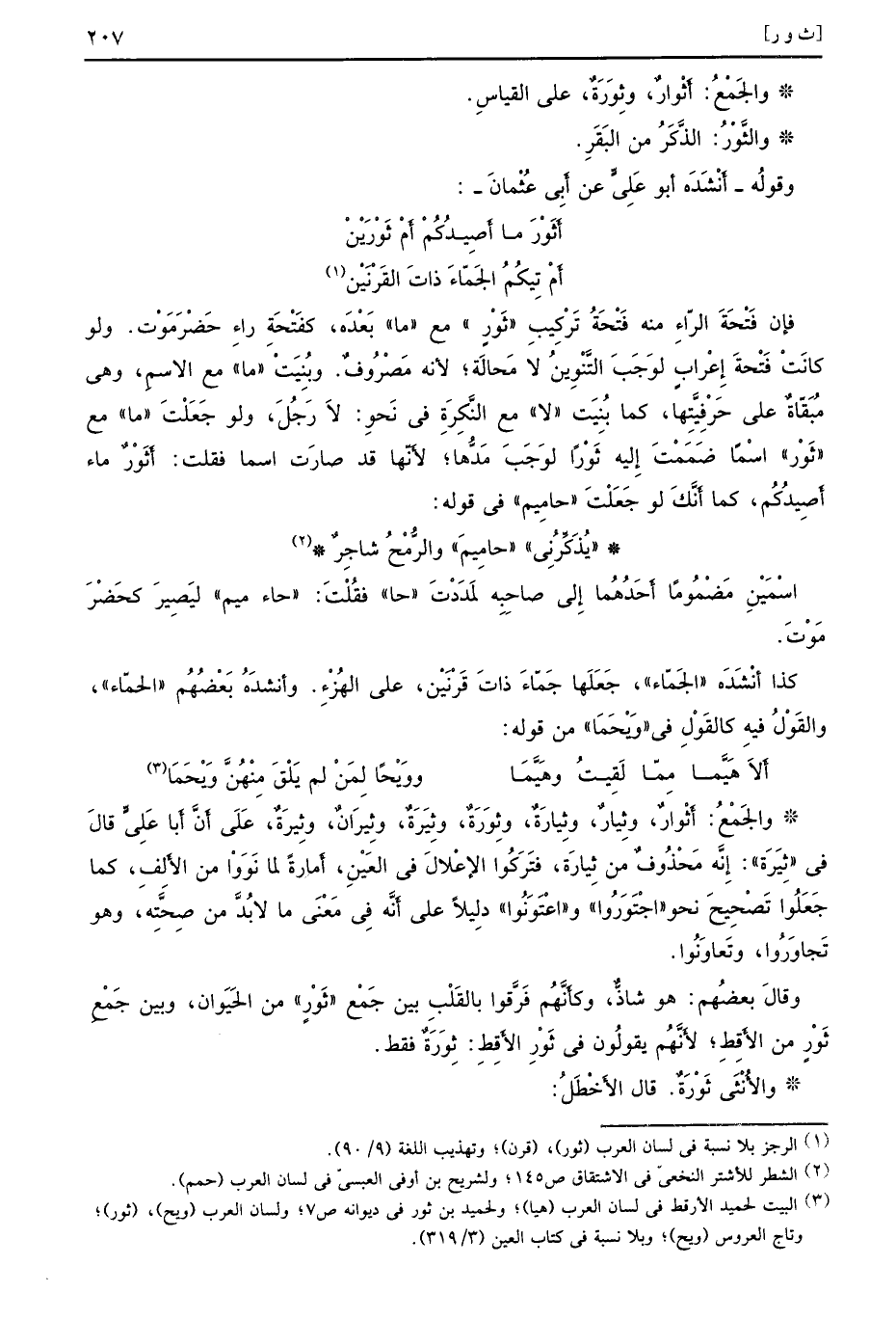 فإن فَتْحَةَ الرّاءِ منه فَتْحَةُ تَرْكِيبِ ثَوْرٍ مع ما بَعْدَه كفَتْحَةِ راءِ حَضْرَمَوُت ولو كانَتْ فَتْحَةَ إِعْرابٍ لوَجَبَ التَّنْوِينُ لا مَحالَة لأنه مَصْرُوفٌ وبُنِيَتْ ما مع الاسمِ وهي مُبَقّاةٌ على حَرْفِيَّتِها كما بُنِيَت لا مع النَّكِرَةِ في نَحوِ لاَ رَجُلَ ولو جَعَلْتَ ما مع ثَوْر اسْمًا ضَمَمْتَ إِليه ثَوْرًا لوَجَبَ مَدُّها لأنّها قد صارَت اسما فقلت أَثَوْرٌ ماء أَصِيدُكُم كما أَنَّكَ لو جَعَلْتَ حامِيم في قوله